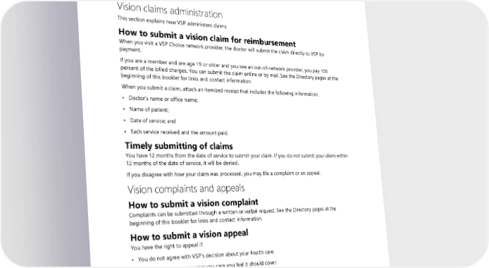 eyewear or low vision aids when noted by the provider every two calendar years when you see a VSP Choice network provider. Supplemental aids The plan pays for covered supplemental aids every two calendar years, which may include: • Optical and non-optical aids; and • Training on how to use the aids. Vision claims administration This section explains how VSP administers claims. How to submit a vision claim for reimbursement When you visit a VSP Choice network provider, the doctor will submit the claim directly to VSP for payment. If you are a member and are age 19 or older and you see an out-of-network provider, you pay 100 percent of the billed charges. You can submit the claim online or by mail. See the Directory pages at the beginning of this booklet for links and contact information. When you submit a claim, attach an itemized receipt that includes the following information: • Doctor’s name or office name; • Name of patient; • Date of service; and • Each service received and the amount paid. Timely submitting of claims You have 12 months from the date of service to submit your claim. If you do not submit your claim within 12 months of the date of service, it will be denied. If you disagree with how your claim was processed, you may file a complaint or an appeal. Vision complaints and appeals How to submit a vision complaint Complaints can be submitted through a written or verbal request. See the Directory pages at the beginning of this booklet for links and contact information. How to submit a vision appeal You have the right to appeal if: • You do not agree with VSP's decision about your health care. • VSP will not approve or give you care you feel it should cover. • VSP is stopping care you feel you still need. VSP normally has 30 days to process your appeal. In some cases, you have a right to an expedited appeal. You can get an expedited appeal if your health or ability to function could be seriously harmed by waiting 30 days for a standard appeal. If you ask for an expedited appeal, VSP will decide whether your request is approved. If not approved, your appeal will be processed in 30 days. If any doctor asks VSP to give you an expedited appeal, or supports your request for an expedited appeal, it must be given to you. 86 2024 UMP Classic (PEBB) Certificate of Coverage