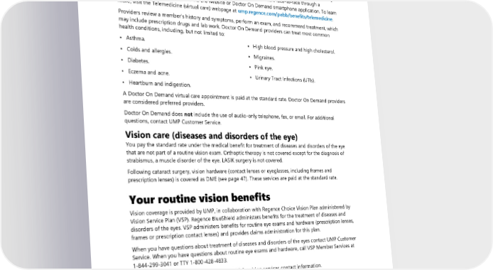 • Telemedicine visits originating from a location other than the specified originating sites Doctor On Demand Doctor On Demand is a virtual care service that gives you access to providers 24 hours a day, 7 days a week. It is a good option to consider when you need medical attention, but not emergency room or urgent care. Doctor On Demand providers are board-certified, U.S.-based providers who are specifically trained in video medicine. Members can connect in minutes with doctors face-to-face through a smartphone, tablet, or computer via the website or Doctor On Demand smartphone application. To learn more, visit the Telemedicine (virtual care) webpage at ump.regence.com/pebb/benefits/telemedicine. Providers review a member's history and symptoms, perform an exam, and recommend treatment, which may include prescription drugs and lab work. Doctor On Demand providers can treat most common health conditions, including, but not limited to: • Asthma. • High blood pressure and high cholesterol. • Colds and allergies. • Migraines. • Diabetes. • Pink eye. • Eczema and acne. • Urinary Tract Infections (UTIs). • Heartburn and indigestion. A Doctor On Demand virtual care appointment is paid at the standard rate. Doctor On Demand providers are considered preferred providers. Doctor On Demand does not include the use of audio-only telephone, fax, or email. For additional questions, contact UMP Customer Service. Vision care (diseases and disorders of the eye) You pay the standard rate under the medical benefit for treatment of diseases and disorders of the eye that are not part of a routine vision exam. Orthoptic therapy is not covered except for the diagnosis of strabismus, a muscle disorder of the eye. LASIK surgery is not covered. Following cataract surgery, vision hardware (contact lenses or eyeglasses, including frames and prescription lenses) is covered as DME (see page 47). These services are paid at the standard rate. Your routine vision benefits Vision coverage is provided by UMP, in collaboration with Regence Choice Vision Plan administered by Vision Service Plan (VSP). Regence BlueShield administers benefits for the treatment of diseases and disorders of the eyes. VSP administers benefits for routine eye exams and hardware (prescription lenses, frames or prescription contact lenses) and provides claims administration for this plan. When you have questions about treatment of diseases and disorders of the eyes contact UMP Customer Service. When you have questions about routine eye exams and hardware, call VSP Member Services at 1-844-299-3041 or TTY 1-800-428-4833. See the Directory at the beginning of the COC for vision services contact information. Finding a routine vision provider Get the most out of your UMP vision benefits and save money with a VSP Choice network provider. As a UMP member, you may search for a VSP Choice network provider for preventive (routine) vision services through the VSP website by logging in to your VSP account or by selecting “Find a doctor,“ and using the advanced search option to select “Choice” for “Doctor network.“ You can also search by signing in to your 2024 UMP Classic (PEBB) Certificate of Coverage 79