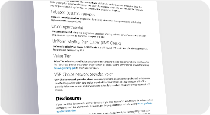 Therapeutic interchange Therapeutic interchange is when a pharmacist, with the endorsing provider’s permission (see page 106), substitutes a nonpreferred prescription drug with a preferred drug that is a therapeutic alternative or equivalent. Tier A prescription drug’s tier tells you how much you will have to pay for a covered prescription drug. The UMP prescription drug benefit categorizes covered prescription drugs into four tiers. See the "What you pay for prescription drugs" section for details on the prescription drug tiers. Tobacco cessation services Tobacco cessation services are provided for quitting tobacco use through counseling and nicotine replacement therapy products. Unicompartmental Unicompartmental refers to a diagnosis or procedure affecting only one part, or “component,” of a joint (e.g. knee) as opposed to more than one part of a joint. Uniform Medical Plan Classic (UMP Classic) Uniform Medical Plan Classic (UMP Classic) is a self-insured PPO health plan offered through the PEBB Program and managed by HCA. Value Tier Value Tier refers to cost-effective prescription drugs that are used to treat certain chronic conditions. See the "What you pay for prescription drugs" section for details. Use the UMP Preferred Drug List by visiting hca.wa.gov/ump-pdl to find Value Tier drugs. VSP Choice network provider, vision VSP Choice network provider, vision means an optometrist or ophthalmologist licensed and otherwise qualified to practice vision care and/or provide vision care materials who has contracted with VSP to provide vision care services and/or vision care materials to members. This plan’s provider network is VSP Choice. Disclosures If you need this document in another format or if you need information about how to file a discrimination complaint, read the UMP nondiscrimination and language assistance notice by visiting hca.wa.gov/ump- nondiscrimination. Advice24, Ardon Health, CoverMyMeds, Moda Health, Postal Prescription Services (PPS), Costco Mail- Order Pharmacy, Washington State Rx Services (WSRxS), Premera Blue Cross, and SmartHealth do not provide Blue Cross Blue Shield services and are separate companies solely responsible for their products/services. VSP is a separate company that provides vision services. Doctor On Demand is a separate company that provides telehealth services. Quartet is a separate company that provides assistance accessing behavioral health services. 2024 UMP Classic (PEBB) Certificate of Coverage 205