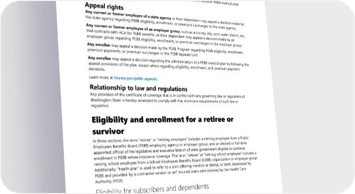 ▪ Fraud, intentional misrepresentation or withholding of information the subscriber knew or should have known was material or necessary to accurately determine eligibility or the correct premium ▪ Abusive or threatening conduct repeatedly directed to an HCA employee, a health plan, or other HCA-contracted vendor providing PEBB insurance coverage on behalf of HCA, its employees, or other persons The PEBB Program will enroll an employee and their eligible dependents in another PEBB medical plan upon termination from this plan. Appeal rights Any current or former employee of a state agency or their dependent may appeal a decision made by the state agency regarding PEBB eligibility, enrollment, or premium surcharges to the state agency. Any current or former employee of an employer group, such as a county, city, port, water district, etc., that contracts with HCA for PEBB benefits, or their dependent may appeal a decision made by an employer group regarding PEBB eligibility, enrollment, or premium surcharges to the employer group. Any enrollee may appeal a decision made by the PEBB Program regarding PEBB eligibility, enrollment, premium payments, or premium surcharges to the PEBB Appeals Unit. Any enrollee may appeal a decision regarding the administration of a PEBB medical plan by following the appeal provisions of the plan, except when regarding eligibility, enrollment, and premium payment decisions. Learn more at hca.wa.gov/pebb-appeals. Relationship to law and regulations Any provision of this certificate of coverage that is in conflict with any governing law or regulation of Washington State is hereby amended to comply with the minimum requirements of such law or regulation. Eligibility and enrollment for a retiree or survivor In these sections, the term “retiree” or “retiring employee” includes a retiring employee from a Public Employees Benefits Board (PEBB) employing agency or employer group, and an elected or full-time appointed official of the legislative and executive branch of state government eligible to continue enrollment in PEBB retiree insurance coverage. The term “retiree” or “retiring school employee” includes a retiring school employee from a School Employees Benefits Board (SEBB) organization or employer group. Additionally, “health plan” is used to refer to a plan offering medical or dental, or both, developed by PEBB and provided by a contracted vendor or self-insured plans administered by the Health Care Authority (HCA). Eligibility for subscribers and dependents Retiree eligibility The PEBB Program determines if a retiring employee or retiring school employee is eligible to enroll in PEBB retiree insurance coverage upon receipt of their election to enroll. If the retiring employee or retiring school employee does not have substantive eligibility or does not meet the procedural requirements for enrollment in PEBB retiree insurance coverage, the PEBB Program will notify them of their right to appeal eligibility decisions. Information about appeals can be found under “Appeal rights.” 2024 UMP Classic (PEBB) Certificate of Coverage 167