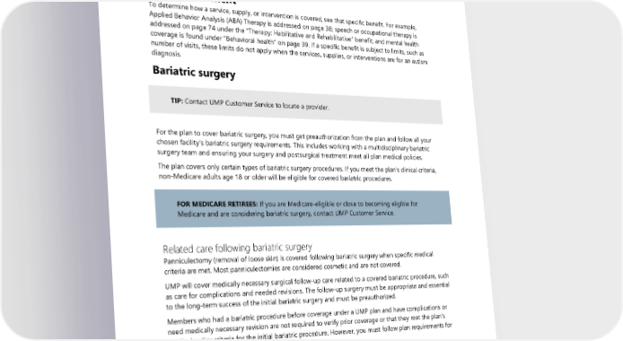 As for other covered services, you receive the highest-level benefit by using preferred providers. See the “Types of services” section for differences in your cost for preferred, participating, and out-of-network providers. To find a preferred provider, visit the UMP Provider search or contact UMP Customer Service. You can also find more information on ABA Therapy by viewing the ABA policy on the UMP Policies that affect your care webpage. See the Directory pages at the beginning of this booklet for links and contact information. Autism treatment To determine how a service, supply, or intervention is covered, see that specific benefit. For example, Applied Behavior Analysis (ABA) Therapy is addressed on page 38; speech or occupational therapy is addressed on page 74 under the “Therapy: Habilitative and Rehabilitative” benefit; and mental health coverage is found under “Behavioral health” on page 39. If a specific benefit is subject to limits, such as number of visits, these limits do not apply when the services, supplies, or interventions are for an autism diagnosis. Bariatric surgery TIP: Contact UMP Customer Service to locate a provider. For the plan to cover bariatric surgery, you must get preauthorization from the plan and follow all your chosen facility’s bariatric surgery requirements. This includes working with a multidisciplinary bariatric surgery team and ensuring your surgery and postsurgical treatment meet all plan medical policies. The plan covers only certain types of bariatric surgery procedures. If you meet the plan’s clinical criteria, non-Medicare adults age 18 or older will be eligible for covered bariatric procedures. FOR MEDICARE RETIREES: If you are Medicare-eligible or close to becoming eligible for Medicare and are considering bariatric surgery, contact UMP Customer Service. Related care following bariatric surgery Panniculectomy (removal of loose skin) is covered following bariatric surgery when specific medical criteria are met. Most panniculectomies are considered cosmetic and are not covered. UMP will cover medically necessary surgical follow-up care related to a covered bariatric procedure, such as care for complications and needed revisions. The follow-up surgery must be appropriate and essential to the long-term success of the initial bariatric surgery and must be preauthorized. Members who had a bariatric procedure before coverage under a UMP plan and have complications or need medically necessary revision are not required to verify prior coverage or that they met the plan’s medical policy criteria for the initial bariatric procedure. However, you must follow plan requirements for follow-up care, including requesting preauthorization. Behavioral health The plan covers behavioral health services including care for mental health and substance use disorder. You pay the inpatient rate when admitted to an inpatient facility, and the standard rate for all other care and services. 2024 UMP Classic (PEBB) Certificate of Coverage 39