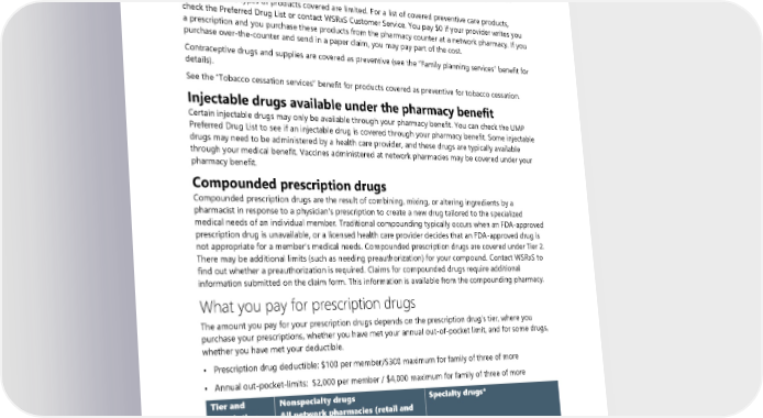 Some products are covered under the preventive care benefit if they: • Are recommended by the U.S. Preventive Services Task Force and the Advisory Committee on Immunization Practices of the Centers for Disease Control and Prevention (see the “Preventive care” benefit); and • Conform to coverage guidelines (see the "How UMP decides which prescription drugs are preferred" section). The brands and types of products covered are limited. For a list of covered preventive care products, check the Preferred Drug List or contact WSRxS Customer Service. You pay $0 if your provider writes you a prescription and you purchase these products from the pharmacy counter at a network pharmacy. If you purchase over-the-counter and send in a paper claim, you may pay part of the cost. Contraceptive drugs and supplies are covered as preventive (see the “Family planning services” benefit for details). See the “Tobacco cessation services” benefit for products covered as preventive for tobacco cessation. Injectable drugs available under the pharmacy benefit Certain injectable drugs may only be available through your pharmacy benefit. You can check the UMP Preferred Drug List to see if an injectable drug is covered through your pharmacy benefit. Some injectable drugs may need to be administered by a health care provider, and these drugs are typically available through your medical benefit. Vaccines administered at network pharmacies may be covered under your pharmacy benefit. Compounded prescription drugs Compounded prescription drugs are the result of combining, mixing, or altering ingredients by a pharmacist in response to a physician’s prescription to create a new drug tailored to the specialized medical needs of an individual member. Traditional compounding typically occurs when an FDA-approved prescription drug is unavailable, or a licensed health care provider decides that an FDA-approved drug is not appropriate for a member’s medical needs. Compounded prescription drugs are covered under Tier 2. There may be additional limits (such as needing preauthorization) for your compound. Contact WSRxS to find out whether a preauthorization is required. Claims for compounded drugs require additional information submitted on the claim form. This information is available from the compounding pharmacy. What you pay for prescription drugs The amount you pay for your prescription drugs depends on the prescription drug’s tier, where you purchase your prescriptions, whether you have met your annual out-of-pocket limit, and for some drugs, whether you have met your deductible. • Prescription drug deductible: $100 per member/$300 maximum for family of three of more • Annual out-pocket-limits: $2,000 per member / $4,000 maximum for family of three of more Tier and Nonspecialty drugs Specialty drugs* description All network pharmacies (retail and mail-order) Preventive • No deductible • No deductible (Preventive)*** • 0% coinsurance • 0% coinsurance Value Tier • No deductible • No deductible (Value) • 0–30-day supply: • 0–30-day supply: 92 2024 UMP Classic (PEBB) Certificate of Coverage