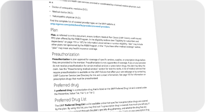 Pharmacy & Therapeutics (P&T) Committee Pharmacy & Therapeutics (P&T) Committee is a group of providers and other health care professionals who review prescription drugs and make recommendations on the status of prescription drugs on the UMP Preferred Drug List (see “The UMP Preferred Drug List” section for more information). Physician services Physician services are health care services provided or coordinated by a licensed medical physician, such as a: • Doctor of osteopathic medicine (D.O.) • Medical doctor (M.D.) • Naturopathic physician (N.D.) Find the complete list of covered provider types on the UMP website at ump.regence.com/pebb/benefits/providers/covered-providers. Plan Plan, as referred to in this document, means Uniform Medical Plan Classic (UMP Classic), a self-insured PPO plan offered by the PEBB Program. In the eligibility sections (see “Eligibility for subscribers and dependents” on page 153 or 167) for information about retiree or survivor eligibility, “plan” may include other plans not sponsored by the PEBB Program. In the “If you have other medical coverage” section, “plan” may mean any health insurance coverage. Preauthorization Preauthorization is plan approval for coverage of specific services, supplies, or prescription drugs before they are provided to the member. Preauthorization is not a guarantee of coverage. If you or your provider do not receive preauthorization for certain medical services or prescription drugs, the plan may deny the claim. See the “Preauthorizing medical services” section for how this works. A list of medical services that require preauthorization is available on the UMP Policies that affect your care webpage or by contacting UMP Customer Service (see Directory for link and contact information). See page 103 for information on prescription drugs that must be preauthorized. Preferred drug A preferred drug is a prescription drug that is listed on the UMP Preferred Drug List and covered under the Preventive, Value Tier, Tier 1, or Tier 2. Preferred Drug List The UMP Preferred Drug List is a list available online that specifies how prescription drugs are covered by the plan. By using this list, you may find out if a prescription drug is covered, how much you will pay, if the drug must be ordered through the plan’s specialty drug pharmacy, and whether the drug has any limitations (such as needing preauthorization or quantity limits; see the ”Limits on your prescription drug coverage” section). Drugs are designated by “tiers”: • Preventive Tier drugs (e.g. contraceptives) cost you $0 • Value Tier are cost-effective prescription drugs for treatment of certain chronic conditions • Tier 1 are primarily generic prescription drugs 198 2024 UMP Classic (PEBB) Certificate of Coverage
