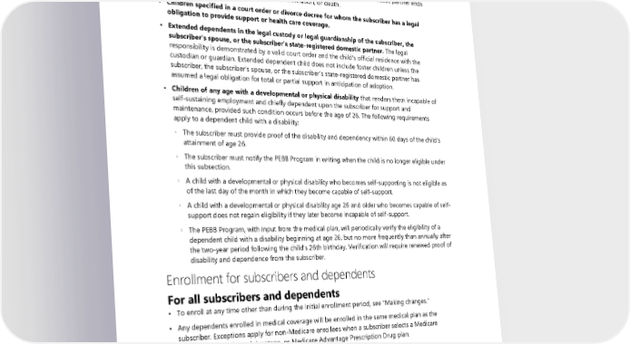 ▪ Children for whom the subscriber has assumed a legal obligation for total or partial support in anticipation of adoption of the child. ▪ Children of the subscriber’s state-registered domestic partner, based on the state-registered domestic partner’s establishment of a parent-child relationship, except when parental rights have been terminated. The child’s relationship to the subscriber (and eligibility as a dependent) ends on the same date the subscriber’s legal relationship with the state-registered domestic partner ends through divorce, annulment, dissolution, termination, or death. ▪ Children specified in a court order or divorce decree for whom the subscriber has a legal obligation to provide support or health care coverage. ▪ Extended dependents in the legal custody or legal guardianship of the subscriber, the subscriber’s spouse, or the subscriber’s state-registered domestic partner. The legal responsibility is demonstrated by a valid court order and the child’s official residence with the custodian or guardian. Extended dependent child does not include foster children unless the subscriber, the subscriber’s spouse, or the subscriber’s state-registered domestic partner has assumed a legal obligation for total or partial support in anticipation of adoption. ▪ Children of any age with a developmental or physical disability that renders them incapable of self-sustaining employment and chiefly dependent upon the subscriber for support and maintenance, provided such condition occurs before the age of 26. The following requirements apply to a dependent child with a disability: ◦ The subscriber must provide proof of the disability and dependency within 60 days of the child’s attainment of age 26. ◦ The subscriber must notify the PEBB Program in writing when the child is no longer eligible under this subsection. ◦ A child with a developmental or physical disability who becomes self-supporting is not eligible as of the last day of the month in which they become capable of self-support. ◦ A child with a developmental or physical disability age 26 and older who becomes capable of self- support does not regain eligibility if they later become incapable of self-support. ◦ The PEBB Program, with input from the medical plan, will periodically verify the eligibility of a dependent child with a disability beginning at age 26, but no more frequently than annually after the two-year period following the child’s 26th birthday. Verification will require renewed proof of disability and dependence from the subscriber. Enrollment for subscribers and dependents For all subscribers and dependents • To enroll at any time other than during the initial enrollment period, see “Making changes.” • Any dependents enrolled in medical coverage will be enrolled in the same medical plan as the subscriber. Exceptions apply for non-Medicare enrollees when a subscriber selects a Medicare Supplement, Medicare Advantage, or Medicare Advantage Prescription Drug plan. Employee enrollment An employee must use Benefits 24/7, the online enrollment system (once available), or submit a PEBB Employee Enrollment/Change or PEBB Employee Enrollment/Change (for Medical Only Groups) form and any supporting documents to their employing agency when they become newly eligible or regain eligibility for PEBB benefits. The online enrollment must be completed or the form must be received no later than 31 days after the date the employee becomes eligible or regains eligibility. 2024 UMP Classic (PEBB) Certificate of Coverage 153