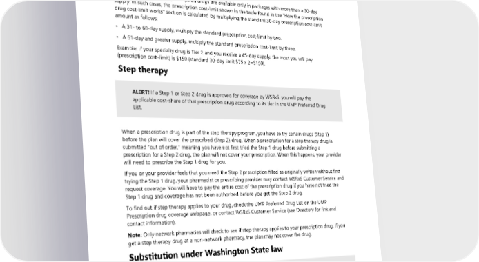See the “How the prescription drug cost-limit works” section for details about the prescription cost-limit. This limit applies to individual prescriptions only. See the “Your prescription drug out-of-pocket limit” section for the annual limit to your prescription drug costs. Specialty drugs are usually limited to no more than a 30-day supply. The prescription cost-limit for a 30- day (or under) supply corresponds to the “You pay” column in the table found in the "How the prescription drug cost-limit works" section. However, some specialty prescription drugs are available only in packages with more than a 30-day supply. In such cases, the prescription cost-limit shown in the table found in the "How the prescription drug cost-limit works" section is calculated by multiplying the standard 30-day prescription cost-limit amount as follows: • A 31- to 60-day supply, multiply the standard prescription cost-limit by two. • A 61-day and greater supply, multiply the standard prescription cost-limit by three. Example: If your specialty drug is Tier 2 and you receive a 45-day supply, the most you will pay (prescription cost-limit) is $150 (standard 30-day limit $75 x 2=$150). Step therapy ALERT! If a Step 1 or Step 2 drug is approved for coverage by WSRxS, you will pay the applicable cost-share of that prescription drug according to its tier in the UMP Preferred Drug List. When a prescription drug is part of the step therapy program, you have to try certain drugs (Step 1) before the plan will cover the prescribed (Step 2) drug. When a prescription for a step therapy drug is submitted “out of order,” meaning you have not first tried the Step 1 drug before submitting a prescription for a Step 2 drug, the plan will not cover your prescription. When this happens, your provider will need to prescribe the Step 1 drug for you. If you or your provider feels that you need the Step 2 prescription filled as originally written without first trying the Step 1 drug, your pharmacist or prescribing provider may contact WSRxS Customer Service and request coverage. You will have to pay the entire cost of the prescription drug if you have not tried the Step 1 drug and coverage has not been authorized before you get the Step 2 drug. To find out if step therapy applies to your drug, check the UMP Preferred Drug List on the UMP Prescription drug coverage webpage, or contact WSRxS Customer Service (see Directory for link and contact information). Note: Only network pharmacies will check to see if step therapy applies to your prescription drug. If you get a step therapy drug at a non-network pharmacy, the plan may not cover the drug. Substitution under Washington State law ALERT! New generic prescription drugs are released throughout the year. If you want to save money by using generics, ask your provider to allow substitution on your prescriptions, even if a generic drug is not available now. That way, when one becomes available, the pharmacist may automatically refill with the generic. 2024 UMP Classic (PEBB) Certificate of Coverage 105