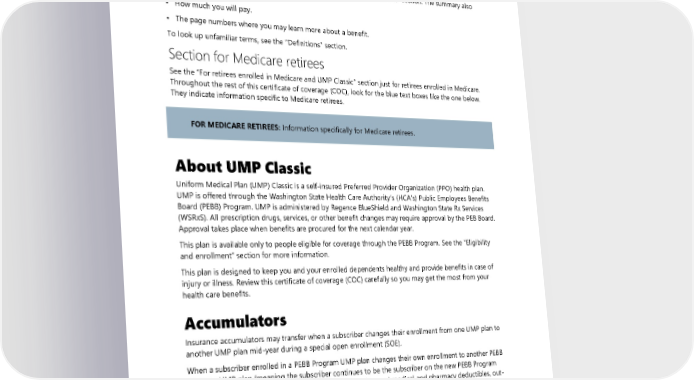 • Review prescription drug policies and programs. How to use this certificate of coverage For general topics, check the table of contents. For an overview of the most common benefits, see the “Summary of benefits” section. The summary also shows: • How much you will pay. • The page numbers where you may learn more about a benefit. To look up unfamiliar terms, see the “Definitions” section. Section for Medicare retirees See the “For retirees enrolled in Medicare and UMP Classic” section just for retirees enrolled in Medicare. Throughout the rest of this certificate of coverage (COC), look for the blue text boxes like the one below. They indicate information specific to Medicare retirees. FOR MEDICARE RETIREES: Information specifically for Medicare retirees. About UMP Classic Uniform Medical Plan (UMP) Classic is a self-insured Preferred Provider Organization (PPO) health plan. UMP is offered through the Washington State Health Care Authority’s (HCA’s) Public Employees Benefits Board (PEBB) Program. UMP is administered by Regence BlueShield and Washington State Rx Services (WSRxS). All prescription drugs, services, or other benefit changes may require approval by the PEB Board. Approval takes place when benefits are procured for the next calendar year. This plan is available only to people eligible for coverage through the PEBB Program. See the “Eligibility and enrollment” section for more information. This plan is designed to keep you and your enrolled dependents healthy and provide benefits in case of injury or illness. Review this certificate of coverage (COC) carefully so you may get the most from your health care benefits. Accumulators Insurance accumulators may transfer when a subscriber changes their enrollment from one UMP plan to another UMP plan mid-year during a special open enrollment (SOE). When a subscriber enrolled in a PEBB Program UMP plan changes their own enrollment to another PEBB Program UMP plan (meaning the subscriber continues to be the subscriber on the new PEBB Program UMP Plan) during an SOE, the amounts already accrued toward medical and pharmacy deductibles, out- of-pocket limits, and benefit limits (see definition of “Limited benefit”) will transfer to the new PEBB Program UMP plan. These accumulators will also transfer for any member on the subscriber’s account who changes UMP plans with the subscriber. When a subscriber enrolled in a SEBB Program UMP plan changes their enrollment to a PEBB Program UMP plan (meaning the subscriber continues to be the subscriber on the new PEBB Program UMP Plan) during an SOE, the amounts already accrued toward the medical and pharmacy deductibles and the out- 14 2024 UMP Classic (PEBB) Certificate of Coverage