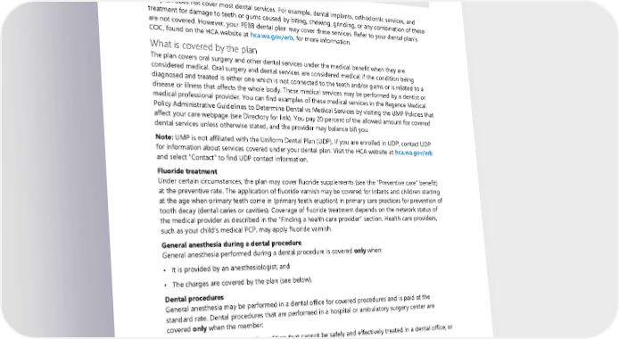 Dental services ALERT! Dentists and other dental providers are not included in the UMP provider network, even if they are listed in the Regence provider directory. The plan does not cover most dental services. For example, dental implants, orthodontic services, and treatment for damage to teeth or gums caused by biting, chewing, grinding, or any combination of these are not covered. However, your PEBB dental plan may cover these services. Refer to your dental plan’s COC, found on the HCA website at hca.wa.gov/erb, for more information. What is covered by the plan The plan covers oral surgery and other dental services under the medical benefit when they are considered medical. Oral surgery and dental services are considered medical if the condition being diagnosed and treated is either one which is not connected to the teeth and/or gums or is related to a disease or illness that affects the whole body. These medical services may be performed by a dentist or medical professional provider. You can find examples of these medical services in the Regence Medical Policy Administrative Guidelines to Determine Dental vs Medical Services by visiting the UMP Policies that affect your care webpage (see Directory for link). You pay 20 percent of the allowed amount for covered dental services unless otherwise stated, and the provider may balance bill you. Note: UMP is not affiliated with the Uniform Dental Plan (UDP). If you are enrolled in UDP, contact UDP for information about services covered under your dental plan. Visit the HCA website at hca.wa.gov/erb and select “Contact” to find UDP contact information. Fluoride treatment Under certain circumstances, the plan may cover fluoride supplements (see the “Preventive care” benefit) at the preventive rate. The application of fluoride varnish may be covered for infants and children starting at the age when primary teeth come in (primary teeth eruption) in primary care practices for prevention of tooth decay (dental caries or cavities). Coverage of fluoride treatment depends on the network status of the medical provider as described in the “Finding a health care provider” section. Health care providers, such as your child’s medical PCP, may apply fluoride varnish. General anesthesia during a dental procedure General anesthesia performed during a dental procedure is covered only when: • It is provided by an anesthesiologist; and • The charges are covered by the plan (see below). Dental procedures General anesthesia may be performed in a dental office for covered procedures and is paid at the standard rate. Dental procedures that are performed in a hospital or ambulatory surgery center are covered only when the member: • Is under age 8 with a dental condition that cannot be safely and effectively treated in a dental office; or • Has a dental condition that cannot be safely and effectively treated in a dental office because of a physical or developmental disability; or • Has a medical condition that would put the member at undue risk if the procedure were performed in a dental office. 44 2024 UMP Classic (PEBB) Certificate of Coverage