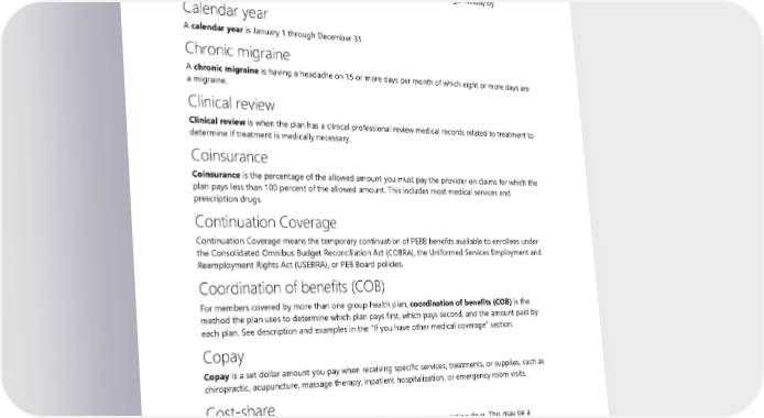 Business day Business days are Mondays through Fridays, except for legal holidays observed by Washington State. Calendar day A calendar day is any day of the week regardless of whether it is observed as a legal holiday by Washington State. Calendar year A calendar year is January 1 through December 31. Chronic migraine A chronic migraine is having a headache on 15 or more days per month of which eight or more days are a migraine. Clinical review Clinical review is when the plan has a clinical professional review medical records related to treatment to determine if treatment is medically necessary. Coinsurance Coinsurance is the percentage of the allowed amount you must pay the provider on claims for which the plan pays less than 100 percent of the allowed amount. This includes most medical services and prescription drugs. Continuation Coverage Continuation Coverage means the temporary continuation of PEBB benefits available to enrollees under the Consolidated Omnibus Budget Reconciliation Act (COBRA), the Uniformed Services Employment and Reemployment Rights Act (USERRA), or PEB Board policies. Coordination of benefits (COB) For members covered by more than one group health plan, coordination of benefits (COB) is the method the plan uses to determine which plan pays first, which pays second, and the amount paid by each plan. See description and examples in the “If you have other medical coverage” section. Copay Copay is a set dollar amount you pay when receiving specific services, treatments, or supplies, such as chiropractic, acupuncture, massage therapy, inpatient hospitalization, or emergency room visits. Cost-share Cost-share means the amount you pay for a service, supply, or prescription drug. This may be a deductible, coinsurance, copay, or amounts not covered by the plan. Custodial care Custodial care is care primarily to assist in activities of daily living, including institutional care primarily to support self-care and provide room and board. Custodial care includes, but is not limited to, help in 184 2024 UMP Classic (PEBB) Certificate of Coverage