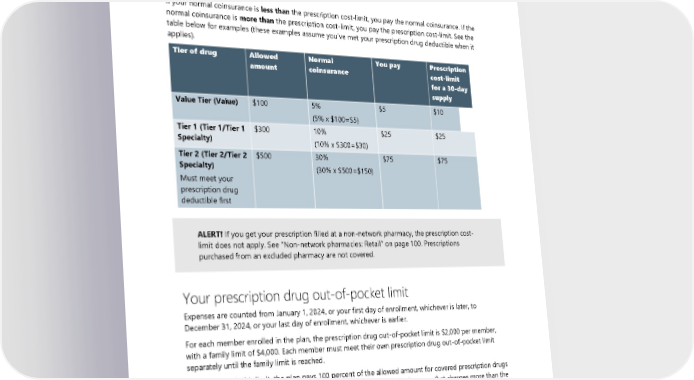 Tier 2 cost-limit after you meet your prescription drug deductible, except for covered insulins. See the UMP Preferred Drug List for cost limits • 0–30-day supply: $75 • 31–60-day supply: $150 • 61–90-day supply: $225 If your normal coinsurance is less than the prescription cost-limit, you pay the normal coinsurance. If the normal coinsurance is more than the prescription cost-limit, you pay the prescription cost-limit. See the table below for examples (these examples assume you’ve met your prescription drug deductible when it applies). Tier of drug Allowed Normal You pay Prescription amount coinsurance cost-limit for a 30-day supply Value Tier (Value) $100 5% $5 $10 (5% x $100=$5) Tier 1 (Tier 1/Tier 1 $300 10% $25 $25 Specialty) (10% x $300=$30) Tier 2 (Tier 2/Tier 2 $500 30% $75 $75 Specialty) (30% x $500=$150) Must meet your prescription drug deductible first ALERT! If you get your prescription filled at a non-network pharmacy, the prescription cost- limit does not apply. See “Non-network pharmacies: Retail” on page 100. Prescriptions purchased from an excluded pharmacy are not covered. Your prescription drug out-of-pocket limit Expenses are counted from January 1, 2024, or your first day of enrollment, whichever is later, to December 31, 2024, or your last day of enrollment, whichever is earlier. For each member enrolled in the plan, the prescription drug out-of-pocket limit is $2,000 per member, with a family limit of $4,000. Each member must meet their own prescription drug out-of-pocket limit separately until the family limit is reached. After you reach this limit, the plan pays 100 percent of the allowed amount for covered prescription drugs and products. If you receive prescription drugs from a non-network pharmacy that charges more than the allowed amount, you must still pay the difference. Prescriptions purchased from an excluded pharmacy are not covered (see the definition of “Excluded pharmacy”) 2024 UMP Classic (PEBB) Certificate of Coverage 97