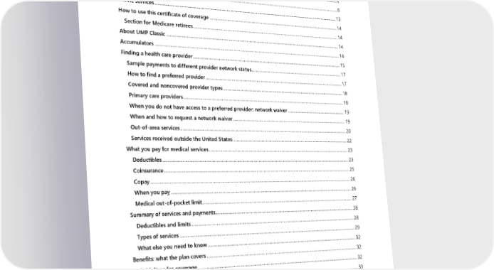 Table of Contents Directory .................................................................................................................................................................................................. 1 Directory: medical services ......................................................................................................................................................... 1 Directory: vision services ............................................................................................................................................................. 4 Directory: prescription drug services ..................................................................................................................................... 6 Online services ................................................................................................................................................................................... 13 How to use this certificate of coverage ................................................................................................................................. 14 Section for Medicare retirees ................................................................................................................................................. 14 About UMP Classic .......................................................................................................................................................................... 14 Accumulators ..................................................................................................................................................................................... 14 Finding a health care provider ................................................................................................................................................... 15 Sample payments to different provider network status ............................................................................................ 17 How to find a preferred provider ......................................................................................................................................... 17 Covered and noncovered provider types ......................................................................................................................... 18 Primary care providers .............................................................................................................................................................. 18 When you do not have access to a preferred provider: network waiver ........................................................... 19 When and how to request a network waiver .................................................................................................................. 19 Out-of-area services ................................................................................................................................................................... 20 Services received outside the United States ................................................................................................................... 22 What you pay for medical services .......................................................................................................................................... 23 Deductibles ..................................................................................................................................................................................... 23 Coinsurance .................................................................................................................................................................................... 25 Copay ................................................................................................................................................................................................ 26 When you pay ............................................................................................................................................................................... 26 Medical out-of-pocket limit .................................................................................................................................................... 27 Summary of services and payments ........................................................................................................................................ 28 Deductibles and limits ............................................................................................................................................................... 28 Types of services .......................................................................................................................................................................... 29 What else you need to know .................................................................................................................................................. 32 Benefits: what the plan covers ................................................................................................................................................... 32 Guidelines for coverage ............................................................................................................................................................ 32 Health Technology Clinical Committee (HTCC) ............................................................................................................. 33 Summary of benefits .................................................................................................................................................................. 34 List of benefits ............................................................................................................................................................................... 37 Acupuncture .......