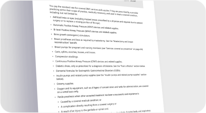 Durable medical equipment (DME), supplies, and prostheses TIP: The plan pays for covered DME at the standard rate. To receive the highest benefit, you must get the equipment or supply from a preferred DME supplier or other preferred medical provider. To find preferred DME providers, see the “Finding a preferred DME supplier” section below. You pay the standard rate for covered DME services and supplies if they are prescribed by a provider practicing within their scope of practice, medically necessary, and used to treat a covered condition, including, but not limited to: • Artificial limbs or eyes (including implant lenses prescribed by a physician and required due to cataract surgery or to replace a missing portion of the eye). • Automatic Positive Airway Pressure (APAP) devices and related supplies. • Bi-level Positive Airway Pressure (BiPAP) devices and related supplies. • Bone growth (osteogenic) stimulators. • Breast prostheses and bras as required by mastectomy. See the “Mastectomy and breast reconstruction” benefit. • Breast pumps for pregnant and nursing members (see “Services covered as preventive” on page 64). • Casts, splints, crutches, trusses, and braces. • Compression stockings. • Continuous Positive Airway Pressure (CPAP) devices and related supplies. • Diabetic shoes, only as prescribed for a diagnosis of diabetes. See the “Foot orthotics” section below. • Elemental formulas for Eosinophilic Gastrointestinal Disorders (EGIDs). • Insulin pumps and related pump supplies (see the “Insulin pumps and related pump supplies” section below). • Ostomy supplies. • Oxygen and its equipment, such as all types of concentrators and tanks for administration, are covered on a rental basis only. • Penile prosthesis when other accepted treatment has been unsuccessful and impotence is: ▪ Caused by a covered medical condition; or ▪ A complication directly resulting from a covered surgery; or ▪ A result of an injury to the genitalia or spinal cord. • Rental or purchase (at the plan’s discretion) of DME such as wheelchairs, hospital beds, and respiratory equipment. (The combined rental fees cannot exceed full purchase price.) • Wig or hairpiece to replace hair loss due to radiation therapy or chemotherapy for a covered condition, up to a lifetime maximum of $100. Wigs and hairpieces for any other reason are not covered. Some items require preauthorization. Find the list of supplies that require a preauthorization by visiting forms and publications at hca.wa.gov/ump-forms-pubs and search “durable medical equipment” or contact UMP Customer Service. 48 2024 UMP Classic (PEBB) Certificate of Coverage