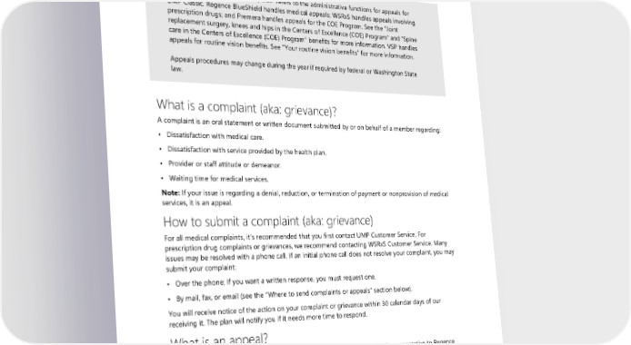 If the plan asks you for more information, you will be allowed at least 45 days to provide it. If the plan does not receive the information requested within the time allowed, the plan will deny the claim. Complaint and appeal procedures ALERT! In the following section, UMP refers to the administrative functions for appeals for UMP Classic. Regence BlueShield handles medical appeals; WSRxS handles appeals involving prescription drugs; and Premera handles appeals for the COE Program. See the “Joint replacement surgery, knees and hips in the Centers of Excellence (COE) Program” and “Spine care in the Centers of Excellence (COE) Program” benefits for more information. VSP handles appeals for routine vision benefits. See “Your routine vision benefits” for more information. Appeals procedures may change during the year if required by federal or Washington State law. What is a complaint (aka: grievance)? A complaint is an oral statement or written document submitted by or on behalf of a member regarding: • Dissatisfaction with medical care. • Dissatisfaction with service provided by the health plan. • Provider or staff attitude or demeanor. • Waiting time for medical services. Note: If your issue is regarding a denial, reduction, or termination of payment or nonprovision of medical services, it is an appeal. How to submit a complaint (aka: grievance) For all medical complaints, it’s recommended that you first contact UMP Customer Service. For prescription drug complaints or grievances, we recommend contacting WSRxS Customer Service. Many issues may be resolved with a phone call. If an initial phone call does not resolve your complaint, you may submit your complaint: • Over the phone: If you want a written response, you must request one. • By mail, fax, or email (see the “Where to send complaints or appeals” section below). You will receive notice of the action on your complaint or grievance within 30 calendar days of our receiving it. The plan will notify you if it needs more time to respond. What is an appeal? An appeal is an oral or written request submitted by you or your authorized representative to Regence BlueShield or WSRxS to reconsider: • A decision to deny, modify, reduce, or terminate payment, coverage, certification, or provision of health care services or benefits, including the admission to, or continued stay in, a health care facility. • A preauthorization. 2024 UMP Classic (PEBB) Certificate of Coverage 137