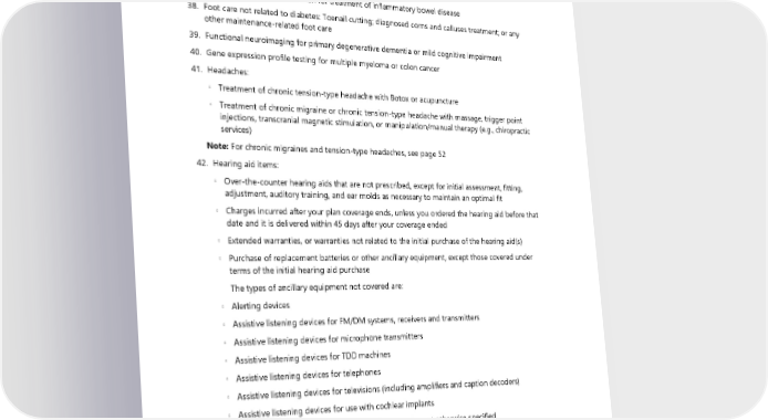 33. Extracorporeal shock wave therapy for musculoskeletal conditions 34. Eye surgery to alter the refractive character of the cornea, such as radial keratotomy, photokeratectomy, or LASIK surgery 35. Facet neurotomy for headache 36. Facet neurotomy for thoracic spine 37. Fecal microbiota transplantation for treatment of inflammatory bowel disease 38. Foot care not related to diabetes: Toenail cutting; diagnosed corns and calluses treatment; or any other maintenance-related foot care 39. Functional neuroimaging for primary degenerative dementia or mild cognitive impairment 40. Gene expression profile testing for multiple myeloma or colon cancer 41. Headaches: ◦ Treatment of chronic tension-type headache with Botox or acupuncture ◦ Treatment of chronic migraine or chronic tension-type headache with massage, trigger point injections, transcranial magnetic stimulation, or manipulation/manual therapy (e.g., chiropractic services) Note: For chronic migraines and tension-type headaches, see page 52 42. Hearing aid items: ◦ Over-the-counter hearing aids that are not prescribed, except for initial assessment, fitting, adjustment, auditory training, and ear molds as necessary to maintain an optimal fit ◦ Charges incurred after your plan coverage ends, unless you ordered the hearing aid before that date and it is delivered within 45 days after your coverage ended ◦ Extended warranties, or warranties not related to the initial purchase of the hearing aid(s) ◦ Purchase of replacement batteries or other ancillary equipment, except those covered under terms of the initial hearing aid purchase The types of ancillary equipment not covered are: ◦ Alerting devices ◦ Assistive listening devices for FM/DM systems, receivers and transmitters ◦ Assistive listening devices for microphone transmitters ◦ Assistive listening devices for TDD machines ◦ Assistive listening devices for telephones ◦ Assistive listening devices for televisions (including amplifiers and caption decoders) ◦ Assistive listening devices for use with cochlear implants ◦ Assistive listening devices, supplies, and accessories not otherwise specified 43. Hip resurfacing 44. Hip surgery for treatment of Femoroacetabular Impingement (FAI) Syndrome 45. Home health care, except as described on page 54. The plan does not cover the following services: ◦ Housekeeping or meal services 114 2024 UMP Classic (PEBB) Certificate of Coverage