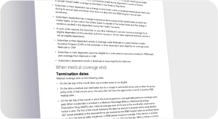 • Subscriber or their dependent loses other coverage under a group health plan or through health insurance coverage, as defined by the Health Insurance Portability and Accountability Act (HIPAA). • Subscriber has a change in employment status that affects their eligibility for the employer contribution toward their employer-based group health plan. • Subscriber’s dependent has a change in their own employment status that affects their eligibility or their dependent’s eligibility for the employer contribution under their employer-based group health plan. “Employer contribution” means contributions made by the dependent’s current or former employer toward health coverage as described in the Treasury Regulation. • Subscriber or their dependent has a change in enrollment under an employer-based group health plan during its annual open enrollment that does not align with the PEBB Program’s annual open enrollment. • Subscriber’s dependent has a change in residence from outside of the United States to within the United States, or from within the United States to outside of the United States and that change in residence resulted in the dependent losing their health insurance. • A court order requires the subscriber or any other individual to provide insurance coverage for an eligible dependent of the subscriber (a former spouse or former state-registered domestic partner is not an eligible dependent). • Subscriber or their dependent enrolls in coverage under Medicaid or a state Children’s Health Insurance Program (CHIP) or the subscriber or their dependent loses eligibility for coverage under Medicaid or CHIP. • Subscriber or their dependent becomes eligible for a state premium assistance subsidy for PEBB health plan coverage from Medicaid or CHIP. • Subscriber’s dependent enrolls in Medicare or loses eligibility for Medicare. When medical coverage ends Termination dates Medical coverage ends on the following dates: • On the last day of the month when any enrollee ceases to be eligible. • On the date a medical plan terminates due to a change in contracted service area or when the group policy ends. If that should occur, the subscriber will have the opportunity to enroll in another PEBB medical plan. • On the last day of the month in which the monthly premium and applicable premium surcharges were paid. When a subscriber is enrolled in a Medicare Advantage (MA) or a Medicare Advantage Prescription Drug (MAPD) plan, medical coverage ends at the end of the month after a termination notice is sent. The first of the month following the date the election is received online using Benefits 24/7 (once available) or the required forms are received by the PEBB Program when an enrolled retiree or survivor requests to defer enrollment in PEBB retiree insurance coverage. If the election is received on the first day of the month, enrollment will be deferred effective that day. When a retiree, a survivor, or their dependent is enrolled in an MA or a MAPD plan, medical plan enrollment will be deferred the first of the month following the date the PEBB Medicare Advantage Plan Disenrollment Form (form D) is received. The last day of the month in which the request is received online using Benefits 24/7 (once available) or the PEBB Program receives a written request and all required forms requesting to voluntarily terminate enrollment in a medical plan. If a future date is specified, medical coverage terminates the last day of the month specified. If the termination request is received on the first day of the month, medical plan enrollment will be terminated on the last day of the previous month. When a 178 2024 UMP Classic (PEBB) Certificate of Coverage