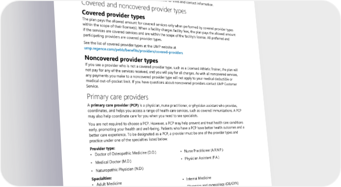 • Use the Regence mobile application to find providers in your network. • Call Blue Cross Blue Shield Global® Core Service Center at 1-800-810-2583 or call collect at 1-804-673- 1177 to find providers outside the U.S. You can also use the online provider search tool on the Blue Cross Blue Shield Global Core website at bcbsglobalcore.com. • Visit the Prescription drug coverage webpage to locate network pharmacies. See the Directory pages at the beginning of this booklet for links and contact information. Covered and noncovered provider types Covered provider types The plan pays the allowed amount for covered services only when performed by covered provider types within the scope of their license(s). When a facility charges facility fees, the plan pays the allowed amount if the services are covered services and are within the scope of the facility’s license. All preferred and participating providers are covered provider types. See the list of covered provider types at the UMP website at ump.regence.com/pebb/benefits/providers/covered-providers Noncovered provider types If you see a provider who is not a covered provider type, such as a Licensed Athletic Trainer, the plan will not pay for any of the services received, and you will pay for all charges. As with all noncovered services, any payments you make to a noncovered provider type will not apply to your medical deductible or medical out-of-pocket limit. If you have questions about noncovered providers contact UMP Customer Service. Primary care providers A primary care provider (PCP) is a physician, nurse practitioner, or physician assistant who provides, coordinates, and helps you access a range of health care services, such as covered immunizations. A PCP may also help coordinate care for you when you need to see specialists. You are not required to choose a PCP. However, a PCP may help prevent and treat health care conditions early, promoting your health and well-being. Patients who have a PCP have better health outcomes and a better care experience. To be designated as a PCP, a provider must be one of the provider types and practice under one of the specialties listed below. Provider type: • Doctor of Osteopathic Medicine (D.O.) • Nurse Practitioner (A.R.N.P.) • Medical Doctor (M.D.) • Physician Assistant (P.A.) • Naturopathic Physician (N.D.) Specialties: • Adult Medicine • Internal Medicine • Family Practice • Obstetrics and gynecology (OB/GYN) • General Practice • Pediatrics (for members under age 18) • Geriatrics • Preventive Medicine 18 2024 UMP Classic (PEBB) Certificate of Coverage