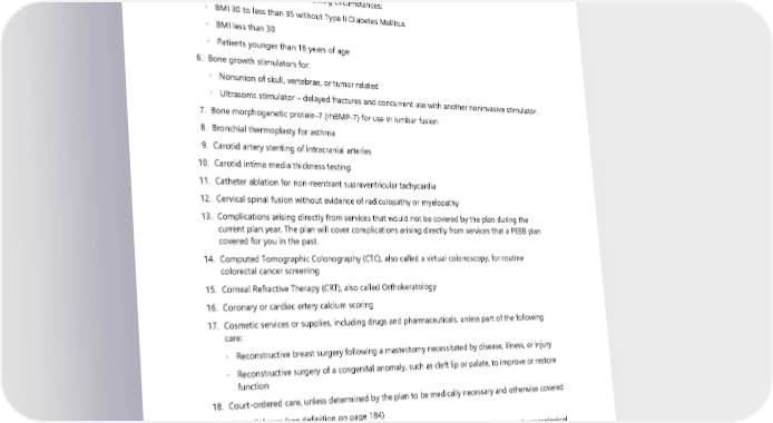 ◦ Sensory movement groups. 2. Air ambulance, if ground ambulance would serve the same purpose 3. Ambulance (all types), to move you to a facility closer to your home or for purposes that are not medically necessary 4. Autologous blood and platelet-rich plasma injections 5. Bariatric surgery under the following circumstances: ◦ BMI 30 to less than 35 without Type II Diabetes Mellitus ◦ BMI less than 30 ◦ Patients younger than 18 years of age 6. Bone growth stimulators for: ◦ Nonunion of skull, vertebrae, or tumor related ◦ Ultrasonic stimulator – delayed fractures and concurrent use with another noninvasive stimulator. 7. Bone morphogenetic protein-7 (rhBMP-7) for use in lumbar fusion 8. Bronchial thermoplasty for asthma 9. Carotid artery stenting of intracranial arteries 10. Carotid intima media thickness testing 11. Catheter ablation for non-reentrant supraventricular tachycardia 12. Cervical spinal fusion without evidence of radiculopathy or myelopathy 13. Complications arising directly from services that would not be covered by the plan during the current plan year. The plan will cover complications arising directly from services that a PEBB plan covered for you in the past. 14. Computed Tomographic Colonography (CTC), also called a virtual colonoscopy, for routine colorectal cancer screening 15. Corneal Refractive Therapy (CRT), also called Orthokeratology 16. Coronary or cardiac artery calcium scoring 17. Cosmetic services or supplies, including drugs and pharmaceuticals, unless part of the following care: ◦ Reconstructive breast surgery following a mastectomy necessitated by disease, illness, or injury ◦ Reconstructive surgery of a congenital anomaly, such as cleft lip or palate, to improve or restore function 18. Court-ordered care, unless determined by the plan to be medically necessary and otherwise covered 19. Custodial care (see definition on page 184) 20. Deep brain stimulation and transcranial direct current stimulation when used as nonpharmacological treatments for treatment-resistant depression 21. Dental care for the treatment of problems with teeth or gums, other than the specific covered dental services (see pages 44–45) 22. Dietary/food supplements, including, but not limited to: ◦ Herbal supplements, dietary supplements, and homeopathic drugs 112 2024 UMP Classic (PEBB) Certificate of Coverage