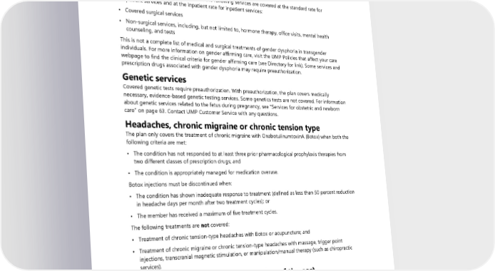 Foot care, maintenance Maintenance foot care includes services such as toenail trimming and corn or callous removal or trimming. These services are covered only for a diagnosis of diabetes and when provided by an approved provider type. The plan does not cover maintenance foot care provided outside the diagnosis of diabetes. Gender affirming care With a diagnosis of gender dysphoria, the following services are covered at the standard rate for outpatient services and at the inpatient rate for inpatient services: • Covered surgical services • Non-surgical services, including, but not limited to, hormone therapy, office visits, mental health counseling, and tests This is not a complete list of medical and surgical treatments of gender dysphoria in transgender individuals. For more information on gender affirming care, visit the UMP Policies that affect your care webpage to find the clinical criteria for gender affirming care (see Directory for link). Some services and prescription drugs associated with gender dysphoria may require preauthorization. Genetic services Covered genetic tests require preauthorization. With preauthorization, the plan covers medically necessary, evidence-based genetic testing services. Some genetics tests are not covered. For information about genetic services related to the fetus during pregnancy, see “Services for obstetric and newborn care” on page 63. Contact UMP Customer Service with any questions. Headaches, chronic migraine or chronic tension type The plan only covers the treatment of chronic migraine with OnabotulinumtoxinA (Botox) when both the following criteria are met: • The condition has not responded to at least three prior pharmacological prophylaxis therapies from two different classes of prescription drugs; and • The condition is appropriately managed for medication overuse. Botox injections must be discontinued when: • The condition has shown inadequate response to treatment (defined as less than 50 percent reduction in headache days per month after two treatment cycles); or • The member has received a maximum of five treatment cycles. The following treatments are not covered: • Treatment of chronic tension-type headaches with Botox or acupuncture; and • Treatment of chronic migraine or chronic tension-type headaches with massage, trigger point injections, transcranial magnetic stimulation, or manipulation/manual therapy (such as chiropractic services). Hearing care (diseases and disorders of the ear) The plan pays under the medical benefit for covered services for treatment of diseases and disorders of the ear or auditory canal not related to routine hearing loss. These services are not part of the “Hearing exam and hearing aids” benefit. 52 2024 UMP Classic (PEBB) Certificate of Coverage