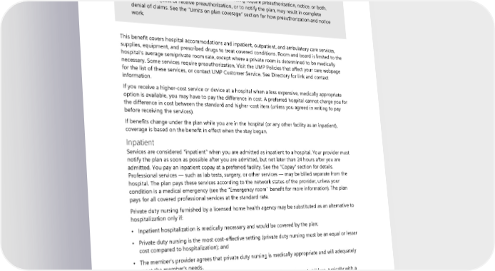• The Washington State Hospital Association’s website at wsha.org/for-patients/end-of-life/. Hospital services ALERT! Many services provided in a hospital setting require preauthorization, notice, or both. Failure to request or receive preauthorization, or to notify the plan, may result in complete denial of claims. See the “Limits on plan coverage” section for how preauthorization and notice work. This benefit covers hospital accommodations and inpatient, outpatient, and ambulatory care services, supplies, equipment, and prescribed drugs to treat covered conditions. Room and board is limited to the hospital’s average semiprivate room rate, except where a private room is determined to be medically necessary. Some services require preauthorization. Visit the UMP Policies that affect your care webpage for the list of these services, or contact UMP Customer Service. See Directory for link and contact information. If you receive a higher-cost service or device at a hospital when a less expensive, medically appropriate option is available, you may have to pay the difference in cost. A preferred hospital cannot charge you for the difference in cost between the standard and higher-cost item (unless you agreed in writing to pay before receiving the services). If benefits change under the plan while you are in the hospital (or any other facility as an inpatient), coverage is based on the benefit in effect when the stay began. Inpatient Services are considered “inpatient” when you are admitted as inpatient to a hospital. Your provider must notify the plan as soon as possible after you are admitted, but not later than 24 hours after you are admitted. You pay an inpatient copay at a preferred facility. See the “Copay” section for details. Professional services — such as lab tests, surgery, or other services — may be billed separate from the hospital. The plan pays these services according to the network status of the provider, unless your condition is a medical emergency (see the “Emergency room" benefit for more information). The plan pays for all covered professional services at the standard rate. Private duty nursing furnished by a licensed home health agency may be substituted as an alternative to hospitalization only if: • Inpatient hospitalization is medically necessary and would be covered by the plan; • Private duty nursing is the most cost-effective setting (private duty nursing must be an equal or lesser cost compared to hospitalization); and • The member's provider agrees that private duty nursing is medically appropriate and will adequately meet the member's needs. Private duty nursing is shift-based, hourly nursing care at home for adults and children, typically with a chronic illness, injury, or disability. Substitution of private duty nursing in lieu of inpatient hospitalization has the same requirements as the hospital benefit. For example, all deductibles and coinsurances apply. 56 2024 UMP Classic (PEBB) Certificate of Coverage