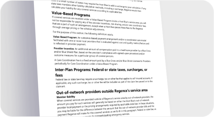 and/or other credits or charges. Occasionally, it may be an average price, based on a discount that results in expected average savings for similar types of health care providers after considering the same types of transactions as with an estimated price. Estimated pricing and average pricing, going forward, also take into account adjustments to correct for over- or underestimation of modifications of past pricing of claims, as noted above. However, such adjustments will not affect the price Regence BlueShield uses for your claim because they will not be applied after a claim has already been paid. Laws in a small number of states may require the Host Blue to add a surcharge to your calculation. If any state laws mandate other liability calculation methods, including a surcharge, Regence would then calculate your liability for any covered services according to applicable law. Value-Based Programs If covered services are received under a Value-Based Program inside a Host Blue's service area, you will not be responsible for paying any of the provider incentives, risk-sharing, and/or care coordinator fees that are a part of such an arrangement, except when a Host Blue passes these fees to the Regence through average pricing or fee schedule adjustments. For the purpose of this section, the following definitions apply. Value-Based Program: An outcomes-based payment arrangement and/or a coordinated care model facilitated with one or more local providers that is evaluated against cost and quality metrics/factors and is reflected in provider payment. Provider Incentive: An additional amount of compensation paid to a healthcare provider by a Blue Cross and/or Blue Shield Plan, based on the provider's compliance with agreed-upon procedural and/or outcome measures for a particular group of covered persons. A Care Coordination Fee is a fixed amount paid by a Blue Cross and/or Blue Shield Licensee to Providers periodically for Care Coordination under a Value-Based Program. Inter-Plan Programs: Federal or state taxes, surcharges, or fees Federal law or state law may require a surcharge, tax or other fee that applies to self-insured accounts. If applicable, any such surcharge, tax or other fee will be included as part of the claim fee passed on to the claimant. Out-of-network providers outside Regence’s service area Member liability When covered services are provided outside of Regence’s service area by out-of-network providers, the amount you pay for such services will generally be based on either the Host Blue’s out-of-network provider local payment or the pricing arrangements required by applicable state law. In these situations, you may be liable for the difference between the amount that the out-of-network provider bills and the payment Regence will make for the covered services as set forth in this paragraph. Federal or state law, as applicable, will govern payments for nonparticipating emergency services. Exceptions In certain situations, Regence may use other payment bases such as billed covered charges, the payment Regence would make if the health care services had been obtained within Regence’s service area, or a special negotiated payment, to determine the amount Regence will pay for services rendered by out-of- network providers. In these situations, you may be liable for the difference between the amount that the out-of-network provider bills and the payment Regence will make for the covered services as set forth in this paragraph. 2024 UMP Classic (PEBB) Certificate of Coverage 21