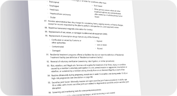 ◦ Approved by the plan ◦ Supported by medical justification from a clinician other than the member or the member’s family 84. Printing costs for medical records 85. Private duty nursing or continuous care in the member's home, except as described on pages 56 and 68 86. Proton beam therapy for individuals age 21 or older for conditions other than: ◦ Brain/spinal ◦ Skull-based ◦ Esophageal ◦ Other primary cancers where all other ◦ Head/neck treatment options are contraindicated ◦ Hepatocellular carcinoma after review by a multidisciplinary tumor board ◦ Ocular 87. Provider administrative fees: Any charges for completing forms, copying records, or finance charges, except for records requested by the plan to perform retrospective (i.e., post-payment) review 88. Repetitive transcranial magnetic stimulation for tinnitus 89. Replacement of lost, stolen, or damaged durable medical equipment (DME) 90. Replacement of prescription drugs that are any of the following: ◦ Confiscated or seized by Customs or ◦ Expired other authorities ◦ Lost or stolen ◦ Contaminated ◦ Ruined ◦ Damaged 91. Residential treatment programs offered at facilities that do not meet the definition of Residential Treatment Facility (see definition of “Residential treatment facility”) 92. Reversal of voluntary sterilization (vasectomy, tubal ligation, or similar procedures) 93. Riot, rebellion, and illegal acts: Services and supplies for treatment of an illness, injury, or condition caused by a member’s voluntary participation in a riot, armed invasion or aggression, insurrection or rebellion, or sustained by a member arising directly from an act deemed illegal by a court of law 94. Routine ultrasounds during pregnancy, except one in week 13 or earlier, one during weeks 13-28, or high-risk pregnancies (see description on page 64) 95. Sacroiliac joint fusion: Minimally invasive and open sacroiliac joint fusion procedures in adults, age 18 or older, with chronic sacroiliac joint pain related to degenerative sacroiliitis and/or sacroiliac joint disruption 96. Screening and monitoring tests for osteopenia/osteoporosis: ◦ Once treatment for osteoporosis has begun, serial monitoring is not covered ◦ Development of a fragility fracture alone is not a covered indication 97. Separate charges for records or reports 98. Service animals: Any expenses related to a service animal 99. Services covered by other insurance, including, but not limited to: ◦ Automobile no-fault ◦ Commercial premises 2024 UMP Classic (PEBB) Certificate of Coverage 117