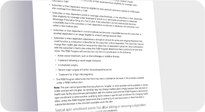 not elect a new medical plan as required, they will be enrolled in a PEBB medical plan designated by the director of HCA or their designee. • A court order requires the subscriber or any other individual to provide insurance coverage for an eligible dependent of the subscriber (a former spouse or former state-registered domestic partner is not an eligible dependent). • Subscriber or their dependent enrolls in coverage under Medicaid or a state Children’s Health Insurance Program (CHIP), or the subscriber or their dependent loses eligibility for coverage under Medicaid or CHIP. • Subscriber or their dependent becomes eligible for state premium assistance subsidy for PEBB health plan coverage from Medicaid or CHIP. • Subscriber or their dependent enrolls in coverage under Medicare, or the subscriber or their dependent loses eligibility for coverage under Medicare or enrolls in or terminates enrollment in a Medicare Advantage Prescription Drug or a Part D plan. If the subscriber’s current medical plan becomes unavailable due to the subscriber or their dependents enrollment in Medicare, the subscriber must select a new medical plan. • Subscriber or their dependent’s current medical plan becomes unavailable because the subscriber or enrolled dependent is no longer eligible for a health savings account (HSA). • Subscriber or their dependent experiences a disruption of care for active and ongoing treatment that could function as a reduction in benefits for the subscriber or their dependent. The subscriber may not change their health plan election because the subscriber or dependent’s physician stops participation with the subscriber’s health plan unless the PEBB Program determines that a continuity of care issue exists. The PEBB Program will consider but not limit its consideration to the following: ▪ Active cancer treatment, such as chemotherapy or radiation therapy ▪ Treatment following a recent organ transplant ▪ A scheduled surgery ▪ Recent major surgery still within the postoperative period ▪ Treatment for a high-risk pregnancy ▪ The PEBB Program determines that there has been a substantial decrease in the providers available under a PEBB medical plan. Note: The plan cannot guarantee that any physician, hospital, or other provider will be available or remain under contract with the plan. An enrollee may not change medical plans simply because their provider or health care facility discontinues participation with this medical plan until the PEBB Program’s next annual open enrollment or when another qualifying event creates a special open enrollment for changing health plans, unless the PEBB Program determines that a continuity of care issue exists or there has been a substantial decrease in the providers available under the plan. Special open enrollment events that allow adding or removing a dependent Any of the following events may create a special open enrollment: • Subscriber gains a new dependent due to: ▪ Marriage or registering a state-registered domestic partnership. ▪ Birth, adoption, or when the subscriber has assumed a legal obligation for total or partial support in anticipation of adoption. ▪ A child becoming eligible as an extended dependent through legal custody or legal guardianship. 2024 UMP Classic (PEBB) Certificate of Coverage 177