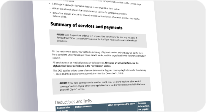 H. Amounts paid for services over a benefit limit. For example, the benefit limit for acupuncture is 24 visits. If you have more than 24 acupuncture visits in one year, you will pay in full for those visits, and what you pay will not count toward this limit. What you pay after reaching this limit After you meet your out-of-pocket limit for the year, you pay: • $0 of the allowed amount for covered medical services from preferred providers and for covered drugs at network pharmacies. • C through H (above) in the “What does not count toward this limit” section. • 40% of the allowed amount for covered medical services for participating providers. • 40% of the allowed amount for covered medical services for out-of-network providers. You may be balance billed. Summary of services and payments ALERT! Even if a provider orders a test or prescribes a treatment, the plan may not cover it. Review this COC or contact UMP Customer Service if you have questions about benefits or limitations. On the next several pages, you will find a summary of types of services and what you will pay for them. For a complete understanding of how a benefit works, read the pages listed in the “For more information” column. All services must be medically necessary to be covered. If you see an unfamiliar term, see the alphabetical list of definitions in the “Definitions” section. This COC applies only to dates of service between the day your coverage begins (no earlier than January 1, 2024) and the day your coverage ends (no later than December 31, 2024). ALERT! If you have coverage under another health plan, see the “If you have other medical coverage” section. If your other coverage is Medicare, see the “For retirees enrolled in Medicare and UMP Classic" section. Deductibles and limits Deductibles Dollar amounts What else you need to know For more and limits information, see page(s) Medical $250 per member (maximum of You must meet your medical 23–25 deductible $750 for a family of three or deductible before the plan pays more) for covered medical services. See page 24 if you earned the Not all services count toward SmartHealth wellness incentive your deductible. in 2023 for plan year 2024. 28 2024 UMP Classic (PEBB) Certificate of Coverage