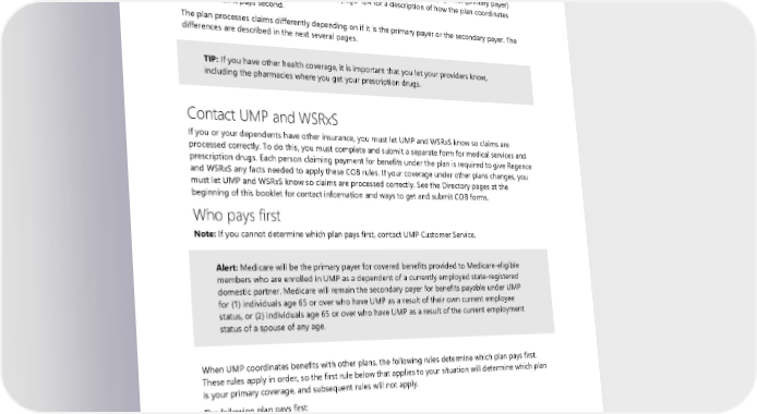 Coordination of benefits Coordination of benefits (COB) happens when you have health coverage through two or more groups (such as your employer and your spouse’s employer), and these two group health plans both pay a portion of your health care claims. The rules beginning under the “Who pays first” section determine which plan pays first (primary payer) and which pays second (secondary payer). See page 124 for a description of how the plan coordinates benefits when it pays second. The plan processes claims differently depending on if it is the primary payer or the secondary payer. The differences are described in the next several pages. TIP: If you have other health coverage, it is important that you let your providers know, including the pharmacies where you get your prescription drugs. Contact UMP and WSRxS If you or your dependents have other insurance, you must let UMP and WSRxS know so claims are processed correctly. To do this, you must complete and submit a separate form for medical services and prescription drugs. Each person claiming payment for benefits under the plan is required to give Regence and WSRxS any facts needed to apply these COB rules. If your coverage under other plans changes, you must let UMP and WSRxS know so claims are processed correctly. See the Directory pages at the beginning of this booklet for contact information and ways to get and submit COB forms. Who pays first Note: If you cannot determine which plan pays first, contact UMP Customer Service. Alert: Medicare will be the primary payer for covered benefits provided to Medicare-eligible members who are enrolled in UMP as a dependent of a currently employed state-registered domestic partner. Medicare will remain the secondary payer for benefits payable under UMP for (1) individuals age 65 or over who have UMP as a result of their own current employee status, or (2) individuals age 65 or over who have UMP as a result of the current employment status of a spouse of any age. When UMP coordinates benefits with other plans, the following rules determine which plan pays first. These rules apply in order, so the first rule below that applies to your situation will determine which plan is your primary coverage, and subsequent rules will not apply. The following plan pays first: • Any group plan that does not coordinate benefits. • The plan that covers the member as a subscriber, not a dependent. Exception: When the subscriber is a Medicare beneficiary, the plan covering the person as the retiree is secondary to the plan covering the person as a dependent. • The plan that covers the member (or their spouse or state-registered domestic partner) as an active employee pays before a plan that covers the member as a retired employee. 122 2024 UMP Classic (PEBB) Certificate of Coverage