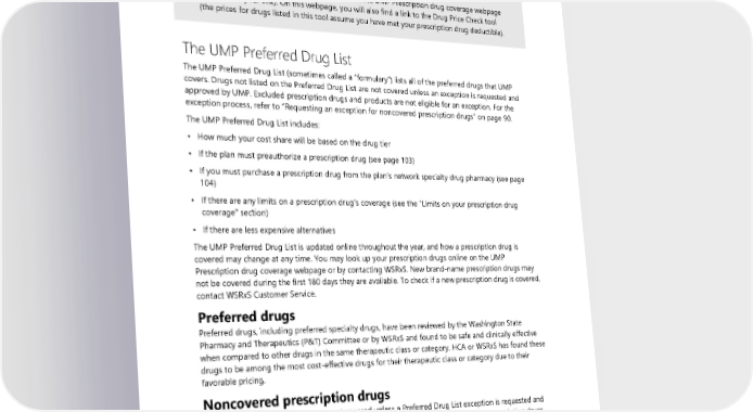 Contact the mail-order or specialty drug pharmacy directly for help placing or tracking prescription orders. If additional help is needed, contact WSRxS Customer Service. Note: Regence BlueShield does not provide prescription drug benefits for UMP. Always contact WSRxS with questions about your prescription drug coverage. TIP: The UMP Preferred Drug List is available on the UMP Prescription drug coverage webpage (see Directory for link). On this webpage, you will also find a link to the Drug Price Check tool (the prices for drugs listed in this tool assume you have met your prescription drug deductible). The UMP Preferred Drug List The UMP Preferred Drug List (sometimes called a “formulary”) lists all of the preferred drugs that UMP covers. Drugs not listed on the Preferred Drug List are not covered unless an exception is requested and approved by UMP. Excluded prescription drugs and products are not eligible for an exception. For the exception process, refer to “Requesting an exception for noncovered prescription drugs” on page 90. The UMP Preferred Drug List includes: • How much your cost share will be based on the drug tier • If the plan must preauthorize a prescription drug (see page 103) • If you must purchase a prescription drug from the plan’s network specialty drug pharmacy (see page 104) • If there are any limits on a prescription drug’s coverage (see the "Limits on your prescription drug coverage" section) • If there are less expensive alternatives The UMP Preferred Drug List is updated online throughout the year, and how a prescription drug is covered may change at any time. You may look up your prescription drugs online on the UMP Prescription drug coverage webpage or by contacting WSRxS. New brand-name prescription drugs may not be covered during the first 180 days they are available. To check if a new prescription drug is covered, contact WSRxS Customer Service. Preferred drugs Preferred drugs, including preferred specialty drugs, have been reviewed by the Washington State Pharmacy and Therapeutics (P&T) Committee or by WSRxS and found to be safe and clinically effective when compared to other drugs in the same therapeutic class or category. HCA or WSRxS has found these drugs to be among the most cost-effective drugs for their therapeutic class or category due to their favorable pricing. Noncovered prescription drugs Noncovered prescription drugs are not covered unless a Preferred Drug List exception is requested and approved (see “Requesting an exception for noncovered prescription drugs”). These prescription drugs have been reviewed by the Washington State Pharmacy and Therapeutics (P&T) Committee or WSRxS. HCA or WSRxS has found these drugs are not as cost-effective and do not have a clinically significant therapeutic advantage over the Preferred Drug List alternative(s). 88 2024 UMP Classic (PEBB) Certificate of Coverage