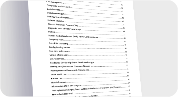 Applied Behavior Analysis (ABA) Therapy ................................................................................................................... 38 Autism treatment .................................................................................................................................................................... 39 Bariatric surgery ....................................................................................................................................................................... 39 Behavioral health .................................................................................................................................................................... 39 Breast health screening tests ............................................................................................................................................. 42 Care Gap Closure Program ................................................................................................................................................. 42 Care management .................................................................................................................................................................. 43 Chiropractic physician services ......................................................................................................................................... 43 Dental services.......................................................................................................................................................................... 44 Diabetes care supplies .......................................................................................................................................................... 45 Diabetes Control Program .................................................................................................................................................. 46 Diabetes education ................................................................................................................................................................ 46 Diabetes Prevention Program (DPP) .............................................................................................................................. 46 Diagnostic tests, laboratory, and x-rays ....................................................................................................................... 47 Dialysis ......................................................................................................................................................................................... 47 Durable medical equipment (DME), supplies, and prostheses........................................................................... 48 Emergency room ..................................................................................................................................................................... 50 End-of-life counseling .......................................................................................................................................................... 50 Family planning services ...................................................................................................................................................... 50 Foot care, maintenance ........................................................................................................................................................ 52 Gender affirming care ........................................................................................................................................................... 52 Genetic services ....................................................................................................................................................................... 52 Headaches, chronic migraine or chronic tension type ........................................................................................... 52 Hearing care (diseases and disorders of the ear) ..................................................................................................... 52 Hearing exam and hearing aids (instruments) .......................................................................................................... 53 Home health care .................................................................................................................................................................... 54 Hospice care .............................................................................................................................................................................. 54 Hospital services ...................................................................................................................................................................... 56 Infusion drug site of care program ................................................................................................................................. 57 Joint replacement surgery, knees and hips in the Centers of Excellence (COE) Program ..................... 57 Knee arthroplasty, total ........................................................................................................................................................ 60 Mammogram and Digital Breast Tomosynthesis (DBT) ........................................................................................ 61 Massage therapy ..................................................................................................................................................................... 61 Mastectomy and breast reconstruction ........................................................................................................................ 62 Mental health ....................................................................................................................