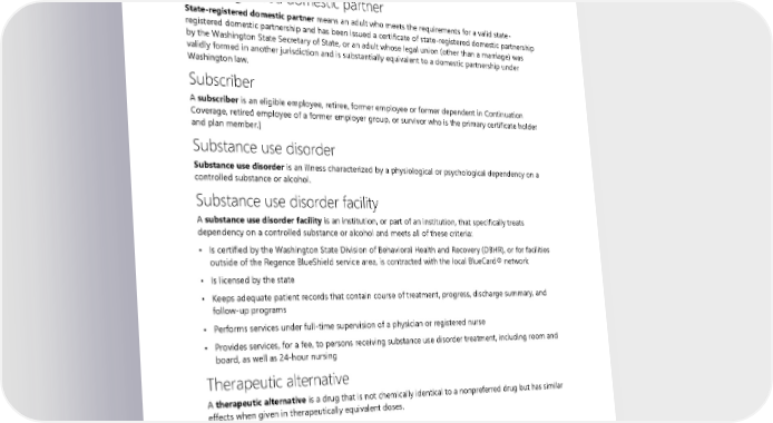 State Agency State agency means an office, department, board, commission, institution, or other separate unit or division, however designated, of the Washington state government. It includes the legislature, executive branch, and agencies or courts within the judicial branch, as well as institutions of higher education and any unit of state government established by law. State-registered domestic partner State-registered domestic partner means an adult who meets the requirements for a valid state- registered domestic partnership and has been issued a certificate of state-registered domestic partnership by the Washington State Secretary of State, or an adult whose legal union (other than a marriage) was validly formed in another jurisdiction and is substantially equivalent to a domestic partnership under Washington law. Subscriber A subscriber is an eligible employee, retiree, former employee or former dependent in Continuation Coverage, retired employee of a former employer group, or survivor who is the primary certificate holder and plan member.] Substance use disorder Substance use disorder is an illness characterized by a physiological or psychological dependency on a controlled substance or alcohol. Substance use disorder facility A substance use disorder facility is an institution, or part of an institution, that specifically treats dependency on a controlled substance or alcohol and meets all of these criteria: • Is certified by the Washington State Division of Behavioral Health and Recovery (DBHR), or for facilities outside of the Regence BlueShield service area, is contracted with the local BlueCard® network • Is licensed by the state • Keeps adequate patient records that contain course of treatment, progress, discharge summary, and follow-up programs • Performs services under full-time supervision of a physician or registered nurse • Provides services, for a fee, to persons receiving substance use disorder treatment, including room and board, as well as 24-hour nursing Therapeutic alternative A therapeutic alternative is a drug that is not chemically identical to a nonpreferred drug but has similar effects when given in therapeutically equivalent doses. Therapeutic equivalent A therapeutic equivalent is a drug that is chemically identical to a nonpreferred drug and is expected to have the same effectiveness and toxicity when given in the same doses. 204 2024 UMP Classic (PEBB) Certificate of Coverage