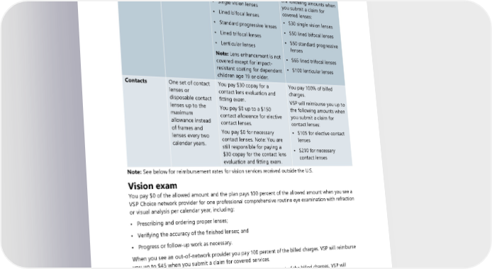 Benefit Frequency Your cost with a VSP Choice Your cost with an out-of- network provider network provider Lenses and One set every two You pay $0 for the following You pay 100% of billed enhancements calendar years. covered lenses and the plan charges. pays 100% of the allowed VSP will reimburse you up to amount: the following amounts when • Single vision lenses you submit a claim for • Lined bifocal lenses covered lenses: • Standard progressive lenses • $30 single vision lenses • Lined trifocal lenses • $50 lined bifocal lenses • Lenticular lenses • $50 standard progressive lenses Note: Lens enhancement is not • $65 lined trifocal lenses covered except for impact- • $100 lenticular lenses resistant coating for dependent children age 19 or older. Contacts One set of contact You pay $30 copay for a You pay 100% of billed lenses or contact lens evaluation and charges. disposable contact fitting exam. VSP will reimburse you up to lenses up to the You pay $0 up to a $150 the following amounts when maximum contact allowance for elective you submit a claim for allowance instead contact lenses. contact lenses: of frames and You pay $0 for necessary • $105 for elective contact lenses every two contact lenses. Note: You are lenses calendar years. still responsible for paying a • $210 for necessary $30 copay for the contact lens contact lenses evaluation and fitting exam. Note: See below for reimbursement rates for vision services received outside the U.S. Vision exam You pay $0 of the allowed amount and the plan pays 100 percent of the allowed amount when you see a VSP Choice network provider for one professional comprehensive routine eye examination with refraction or visual analysis per calendar year, including: • Prescribing and ordering proper lenses; • Verifying the accuracy of the finished lenses; and • Progress or follow-up work as necessary. When you see an out-of-network provider you pay 100 percent of the billed charges. VSP will reimburse you up to $45 when you submit a claim for covered services. When you receive services outside the country, you pay 100 percent of the billed charges. VSP will reimburse you up to $80 when you submit a claim for covered services. Vision hardware Lenses for glasses You pay $0 of the allowed amount and the plan pays 100 percent of the allowed amount once every two calendar years for one set of covered glass or plastic lenses: 2024 UMP Classic (PEBB) Certificate of Coverage 81
