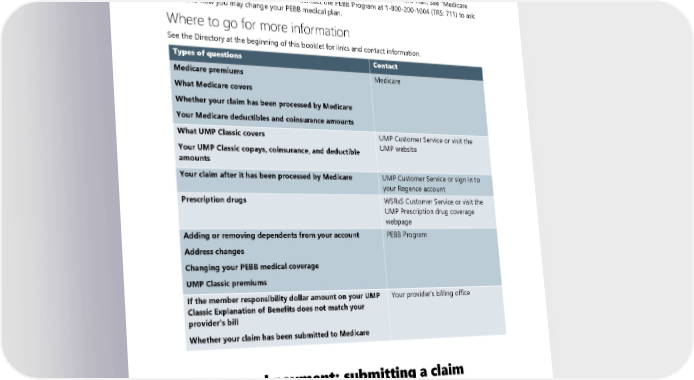 You may not have UMP Classic and Medicare Part D You may not enroll in both UMP Classic and a Medicare Part D prescription drug plan. UMP Classic provides your prescription drug coverage and you may not have both. Medicare will notify the PEBB Program if you enroll in a Part D plan while enrolled in UMP Classic. You could lose your eligibility for PEBB retiree health plan coverage if you do this. If you think you want a Part D prescription drug plan, you must change your medical plan from UMP Classic to a PEBB Medicare Supplement Plan. See “Medicare Part D” on page (X) for more information. Contact the PEBB Program at 1-800-200-1004 (TRS: 711) to ask when and how you may change your PEBB medical plan. Where to go for more information See the Directory at the beginning of this booklet for links and contact information. Types of questions Contact Medicare premiums Medicare What Medicare covers Whether your claim has been processed by Medicare Your Medicare deductibles and coinsurance amounts What UMP Classic covers UMP Customer Service or visit the Your UMP Classic copays, coinsurance, and deductible UMP website amounts Your claim after it has been processed by Medicare UMP Customer Service or sign in to your Regence account Prescription drugs WSRxS Customer Service or visit the UMP Prescription drug coverage webpage Adding or removing dependents from your account PEBB Program Address changes Changing your PEBB medical coverage UMP Classic premiums If the member responsibility dollar amount on your UMP Your provider’s billing office Classic Explanation of Benefits does not match your provider’s bill Whether your claim has been submitted to Medicare Billing and payment: submitting a claim FOR MEDICARE RETIREES: Read the “For Retirees Enrolled in Medicare and UMP Classic” section. 2024 UMP Classic (PEBB) Certificate of Coverage 133