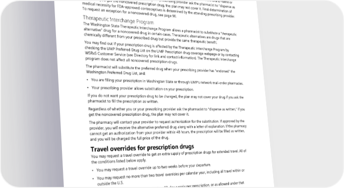 When a brand-name or biologic prescription drug has a generic equivalent or interchangeable biosimilar, pharmacists in Washington State must substitute the generic equivalent or interchangeable biosimilar drug for the brand-name or biologic prescription drug. When a generic equivalent for a brand-name prescription drug becomes available, the brand-name drug immediately becomes noncovered. Your provider may write the prescription “dispense as written” if they want you to get only the prescribed brand-name or biologic prescription drug. Or you may tell the pharmacist you want the brand-name or biologic drug. Regardless of whether you or your prescribing provider ask the pharmacist to “dispense as written,” if you get the noncovered prescription drug, the plan may not cover it. Final determination of medical necessity for FDA-approved contraceptives is determined by the attending prescribing provider. To request an exception for a noncovered drug, see page 90. Therapeutic Interchange Program The Washington State Therapeutic Interchange Program allows a pharmacist to substitute a “therapeutic alternative” drug for a noncovered drug in certain cases. Therapeutic alternatives are drugs that are chemically different from your prescribed drug but provide the same therapeutic benefit. You may find out if your prescription drug is affected by the Therapeutic Interchange Program by checking the UMP Preferred Drug List on the UMP Prescription drug coverage webpage or by contacting WSRxS Customer Service (see Directory for link and contact information). The Therapeutic Interchange program does not affect all noncovered prescription drugs. The pharmacist will substitute the preferred drug when your prescribing provider has “endorsed” the Washington Preferred Drug List, and: • You are filling your prescription in Washington State or through UMP’s network mail-order pharmacies. • Your prescribing provider allows substitution on your prescription. If you do not want your prescription drug to be changed, the plan may not cover your drug if you ask the pharmacist to fill the prescription as written. Regardless of whether you or your prescribing provider ask the pharmacist to “dispense as written,” if you get the noncovered prescription drug, the plan may not cover it. The pharmacy will contact your provider to request authorization for the substitution. If approved by the provider, you will receive the alternative preferred drug along with a letter of explanation. If the pharmacy cannot get an authorization from your provider within 48 hours, the prescription will be filled as written, and you will be charged the full price of the drug. Travel overrides for prescription drugs You may request a travel override to get an extra supply of prescription drugs for extended travel. All of the conditions listed below apply. • You may request a travel override up to two weeks before your departure. • You may request no more than two travel overrides per calendar year, including all travel within or outside the U.S. • Within the U.S., you may request up to a 90-day supply per prescription, or as allowed under that prescription. • Outside the U.S., you may request up to a six-month supply per prescription, or as allowed under that prescription. • Travel overrides will be granted only while you are covered by the plan. If your eligibility is ending, the plan does not cover prescription drugs past the time your enrollment in the plan ends. • You will pay applicable charges (deductible and coinsurance) for each extra supply received. 106 2024 UMP Classic (PEBB) Certificate of Coverage