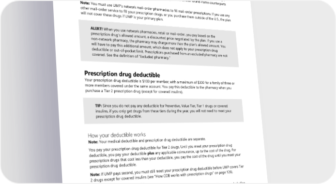 information). You may purchase up to a 90-day supply for most prescription drugs. For most specialty drugs, you may purchase up to a 30-day supply. To check your cost, use the Drug Price Check tool on the UMP Prescription drug coverage webpage (the prices for drugs listed in this tool assume you have met your prescription drug deductible). Using Value Tier and Tier 1 drugs reduces prescription costs for both you and the plan. Generic drugs, follow-on biologics, and biosimilars have the same active ingredient as their brand-name counterparts and are usually less expensive. Note: You must use UMP’s network mail-order pharmacies to fill mail-order prescriptions. If you use any other mail-order service to fill your prescription drugs, or you purchase them outside of the U.S., the plan will not cover these drugs if UMP is your primary plan. ALERT! When you use network pharmacies, retail or mail-order, you pay based on the prescription drug’s allowed amount, a discounted price negotiated by the plan. If you use a non-network pharmacy, the pharmacy may charge more than the plan’s allowed amount. You will have to pay this additional amount, which does not apply to your prescription drug deductible or out-of-pocket limit. Prescriptions purchased from an excluded pharmacy are not covered. See the definition of “Excluded pharmacy.” Prescription drug deductible Your prescription drug deductible is $100 per member, with a maximum of $300 for a family of three or more members covered under the same account. You pay this deductible to the pharmacy when you purchase a Tier 2 prescription drug (except for covered insulins). TIP: Since you do not pay any deductible for Preventive, Value Tier, Tier 1 drugs or covered insulins, if you only get drugs from these tiers during the year, you will not need to meet your prescription drug deductible. How your deductible works Note: Your medical deductible and prescription drug deductible are separate. You pay your prescription drug deductible for Tier 2 drugs. Until you meet your prescription drug deductible, you pay your deductible plus any applicable coinsurance, up to the cost of the drug. For prescription drugs that cost less than your deductible, you pay the cost of the drug until you meet your prescription drug deductible. Note: If UMP pays second, you must still meet your prescription drug deductible before UMP covers Tier 2 drugs except for covered insulins (see “How COB works with prescription drugs” on page 126). What applies to your deductible The following paid by the member directly or paid on behalf of the member by another person including payments made through a manufacturer drug coupon or other manufacturer discount: • Amounts paid toward covered Tier 2 prescription drugs. • Amounts paid toward supplies designated as Tier 2 and covered under the prescription drug benefit. • Amounts paid toward covered insulins. 94 2024 UMP Classic (PEBB) Certificate of Coverage