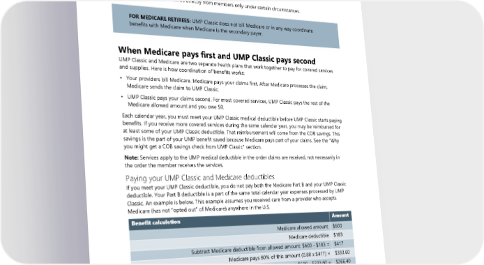 When UMP Classic pays first and Medicare pays second If UMP Classic pays first and Medicare pays second, make sure that you tell Medicare about your UMP Classic coverage and that your provider agrees to bill Medicare as secondary to get the maximum benefit from both plans. Medicare generally accepts claims only from providers, so you may not be able to send a claim to Medicare for secondary payment. The provider would need to bill Medicare after UMP Classic has processed the claim. Note: Medicare accepts claims directly from members only under certain circumstances. FOR MEDICARE RETIREES: UMP Classic does not bill Medicare or in any way coordinate benefits with Medicare when Medicare is the secondary payer. When Medicare pays first and UMP Classic pays second UMP Classic and Medicare are two separate health plans that work together to pay for covered services and supplies. Here is how coordination of benefits works: • Your providers bill Medicare. Medicare pays your claims first. After Medicare processes the claim, Medicare sends the claim to UMP Classic. • UMP Classic pays your claims second. For most covered services, UMP Classic pays the rest of the Medicare allowed amount and you owe $0. Each calendar year, you must meet your UMP Classic medical deductible before UMP Classic starts paying benefits. If you receive more covered services during the same calendar year, you may be reimbursed for at least some of your UMP Classic deductible. That reimbursement will come from the COB savings. This savings is the part of your UMP benefit saved because Medicare pays part of your claims. See the “Why you might get a COB savings check from UMP Classic” section. Note: Services apply to the UMP medical deductible in the order claims are received, not necessarily in the order the member receives the services. Paying your UMP Classic and Medicare deductibles If you meet your UMP Classic deductible, you do not pay both the Medicare Part B and your UMP Classic deductible. Your Part B deductible is a part of the same total calendar year expenses processed by UMP Classic. An example is below. This example assumes you received care from a provider who accepts Medicare (has not “opted out” of Medicare) anywhere in the U.S. Benefit calculation Amount Medicare allowed amount $600 Medicare deductible $183 Subtract Medicare deductible from allowed amount: $600 - $183 = $417 Medicare pays 80% of this amount (0.80 x $417) = $333.60 Balance remaining after Medicare pays: $600 - $333.60 = $266.40 UMP Classic allowed amount $600 UMP Classic deductible $250 Subtract UMP Classic deductible from allowed amount: $600 - $250 = $350 Normal UMP Classic benefit (85% of this amount) (0.85 x $350) = $297.50 128 2024 UMP Classic (PEBB) Certificate of Coverage
