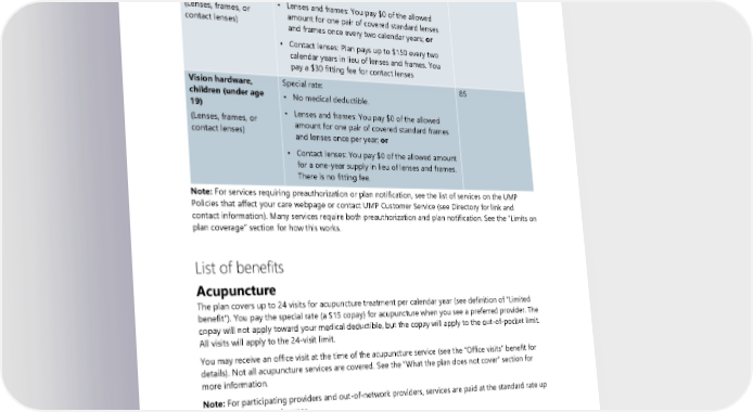 Benefit/service How much you will pay For information, see page(s): Vision care exam Preventive rate 81, 85 (routine) Vision hardware, Special rate: 81 adults (age 19 or • No medical deductible older) • Lenses and frames: You pay $0 of the allowed (Lenses, frames, or amount for one pair of covered standard lenses contact lenses) and frames once every two calendar years; or • Contact lenses: Plan pays up to $150 every two calendar years in lieu of lenses and frames. You pay a $30 fitting fee for contact lenses Vision hardware, Special rate: 85 children (under age • No medical deductible. 19) • Lenses and frames: You pay $0 of the allowed (Lenses, frames, or amount for one pair of covered standard frames contact lenses) and lenses once per year; or • Contact lenses: You pay $0 of the allowed amount for a one-year supply in lieu of lenses and frames. There is no fitting fee. Note: For services requiring preauthorization or plan notification, see the list of services on the UMP Policies that affect your care webpage or contact UMP Customer Service (see Directory for link and contact information). Many services require both preauthorization and plan notification. See the “Limits on plan coverage” section for how this works. List of benefits Acupuncture The plan covers up to 24 visits for acupuncture treatment per calendar year (see definition of “Limited benefit”). You pay the special rate (a $15 copay) for acupuncture when you see a preferred provider. The copay will not apply toward your medical deductible, but the copay will apply to the out-of-pocket limit. All visits will apply to the 24-visit limit. You may receive an office visit at the time of the acupuncture service (see the “Office visits” benefit for details). Not all acupuncture services are covered. See the “What the plan does not cover” section for more information. Note: For participating providers and out-of-network providers, services are paid at the standard rate up to 24 visits per calendar year. Ambulance Ambulance services for personal or convenience purposes are not covered. Ground ambulance You pay 20 percent of the allowed amount for medically necessary ambulance services. Professional ground ambulance services are covered in a medical emergency: 2024 UMP Classic (PEBB) Certificate of Coverage 37