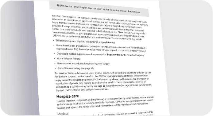 • Assistive listening devices for televisions (including amplifiers and caption decoders) • Assistive listening devices for use with cochlear implants • Assistive listening devices, supplies, and accessories not otherwise specified • Hearing aid batteries Home health care ALERT! See the “What the plan does not cover” section for services the plan does not cover. In certain circumstances, the plan covers short-term, provider-directed, medically necessary home health services on an intermittent or part-time basis by a licensed home health, hospice, or home care agency, to help a member recover from an acute covered illness, injury, or hospital stay. Home Health care is provided through visits from specialized clinicians, performing specific tasks (rather than time-based shifts), on a short-term basis, until specified individual goals are met. These services must be part of a treatment plan written by your provider (such as your physician or advanced registered practitioner [ARNP]). The provider must certify that you are homebound. These short-term visits may include: • Skilled nursing care, physical, occupational, or speech therapy • Home health aides and clinical social services, provided in conjunction with the skilled services of a registered nurse (RN), licensed practical nurse (LPN) or physical, occupational, or speech therapist • Disposable medical supplies as well as prescription drugs provided by the home health agency • Home infusion therapy • Home care of wounds resulting from injury or surgery • End-of-life counseling (see page 50) For services that may be covered under another benefit, such as nutritional counseling or follow-up care for bariatric surgery, see that benefit in this COC for coverage rules and limitations. These limitations apply even if the services are provided in the home or by a home health provider. For information on substitution of private duty nursing as an alternative benefit in lieu of hospitalization or in lieu of admission to a skilled nursing facility, see page 56 (hospital services) or page 68 (skilled nursing facility). Contact UMP Customer Service if you have questions. Hospice care Hospice (inpatient, outpatient, and respite care) is services provided by a state-licensed hospice program in the home or in a hospice facility to terminally ill patients. Services include pain relief care and support services that address the needs of terminally ill members and their families without intent to cure. Medical Hospice services received from preferred and participating providers are covered at 100 percent of the allowed amount after you meet your medical deductible. The plan covers hospice care for terminally ill members for no more than six months. See page 50 for coverage of end-of-life counseling. If you need hospice care, your provider will refer you to the program. For additional assistance, you may contact UMP Customer Service. 54 2024 UMP Classic (PEBB) Certificate of Coverage