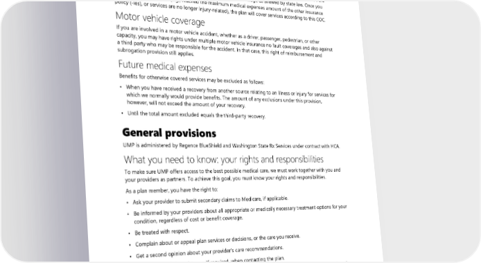 Services covered by other insurance The plan does not cover services that are covered by other insurance, including, but not limited to, no fault automobile medical payments (Med-Pay), no fault automobile personal injury protection (PIP), homeowner’s no-fault coverage, commercial premises no fault medical coverage, or sports policies, including excess, underinsured or uninsured motorist coverage or similar contract or insurance. You are responsible for any cost-sharing required under the other coverage as allowed by state law. Once you have exhausted benefits (e.g., reached the maximum medical expenses amount of the other insurance policy (-ies), or services are no longer injury-related), the plan will cover services according to this COC. Motor vehicle coverage If you are involved in a motor vehicle accident, whether as a driver, passenger, pedestrian, or other capacity, you may have rights under multiple motor vehicle insurance no fault coverages and also against a third party who may be responsible for the accident. In that case, this right of reimbursement and subrogation provision still applies. Future medical expenses Benefits for otherwise covered services may be excluded as follows: • When you have received a recovery from another source relating to an illness or injury for services for which we normally would provide benefits. The amount of any exclusions under this provision, however, will not exceed the amount of your recovery. • Until the total amount excluded equals the third-party recovery. General provisions UMP is administered by Regence BlueShield and Washington State Rx Services under contract with HCA. What you need to know: your rights and responsibilities To make sure UMP offers access to the best possible medical care, we must work together with you and your providers as partners. To achieve this goal, you must know your rights and responsibilities. As a plan member, you have the right to: • Ask your provider to submit secondary claims to Medicare, if applicable. • Be informed by your providers about all appropriate or medically necessary treatment options for your condition, regardless of cost or benefit coverage. • Be treated with respect. • Complain about or appeal plan services or decisions, or the care you receive. • Get a second opinion about your provider’s care recommendations. • Have a translator’s assistance, if required, when contacting the plan. • Keep your medical records and personal information confidential as described in the UMP Notice of Privacy Practices, available online on the HCA website at hca.wa.gov/ump-privacy. • Make decisions with your providers about your health care. • Make recommendations about member rights and responsibilities. 2024 UMP Classic (PEBB) Certificate of Coverage 145