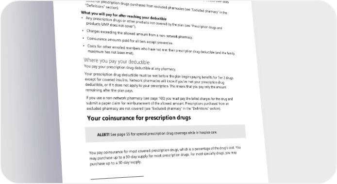 What does not apply to your deductible 1 • Amounts exceeding the allowed amount paid to non-network pharmacies. • Coinsurance amounts paid for Value Tier or Tier 1 prescription drugs except for covered insulins. • Costs for medical services, including prescription drugs covered under the medical benefit. • Costs for prescription drugs not covered by the plan (see “Prescription drugs and products UMP does not cover”). • Costs for prescription drugs purchased from excluded pharmacies (see “Excluded pharmacy” in the “Definitions” section). What you will pay for after reaching your deductible • Any prescription drugs or other products not covered by the plan (see “Prescription drugs and products UMP does not cover”). • Charges exceeding the allowed amount from a non-network pharmacy. • Coinsurance amounts paid for all tiers except preventive. • Costs for other enrolled members who have not met their prescription drug deductible (and the family maximum has not been met). Where you pay your deductible You pay your prescription drug deductible at any pharmacy. Your prescription drug deductible must be met before the plan begins paying benefits for Tier 2 drugs except for covered insulins. Network pharmacies will know if you’ve met your prescription drug deductible, or if it does not apply to your prescription. This means that you pay only the amount remaining after the plan pays. If you use a non-network pharmacy (see page 100) you must pay the billed charges for the drug and submit a paper claim for reimbursement of the allowed amount. Prescriptions purchased from an excluded pharmacy are not covered (see “Excluded pharmacy” in the “Definitions” section). Your coinsurance for prescription drugs ALERT! See page 55 for special prescription drug coverage while in hospice care. You pay coinsurance for most covered prescription drugs, which is a percentage of the drug’s cost. You may purchase up to a 90-day supply for most prescription drugs. For most specialty drugs, you may purchase up to a 30-day supply. 1 Non-network pharmacies may charge more than the allowed amount for prescription drugs. You are responsible for paying this amount in addition to your coinsurance. Prescriptions purchased from an excluded pharmacy are not covered. 2024 UMP Classic (PEBB) Certificate of Coverage 95