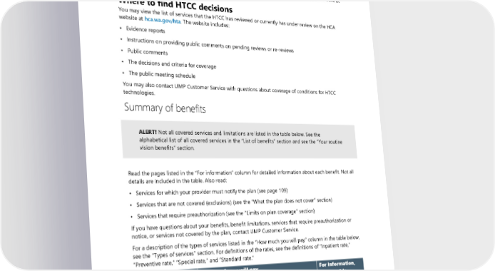 covered with conditions, or not covered. The HTCC determines the conditions, if any, under which the service will be included as a covered benefit and, if covered, the criteria the plan must use to decide whether the service is medically necessary. Criteria established by the HTCC take precedence over Regence’s medical policies. When the HTCC determines that a service is not covered, then the service is not covered by the plan. Some HTCC decisions include a requirement to follow FDA or Centers for Medicare and Medicaid Services (CMS) guidelines. You may review these guidelines on the FDA website at fda.gov or CMS website at cms.gov. Where to find HTCC decisions You may view the list of services that the HTCC has reviewed or currently has under review on the HCA website at hca.wa.gov/hta. The website includes: • Evidence reports • Instructions on providing public comments on pending reviews or re-reviews • Public comments • The decisions and criteria for coverage • The public meeting schedule You may also contact UMP Customer Service with questions about coverage of conditions for HTCC technologies. Summary of benefits ALERT! Not all covered services and limitations are listed in the table below. See the alphabetical list of all covered services in the “List of benefits” section and see the “Your routine vision benefits” section. Read the pages listed in the “For information” column for detailed information about each benefit. Not all details are included in the table. Also read: • Services for which your provider must notify the plan (see page 109) • Services that are not covered (exclusions) (see the “What the plan does not cover” section) • Services that require preauthorization (see the “Limits on plan coverage” section) If you have questions about your benefits, benefit limitations, services that require preauthorization or notice, or services not covered by the plan, contact UMP Customer Service. For a description of the types of services listed in the “How much you will pay” column in the table below, see the “Types of services” section. For definitions of the rates, see the definitions of “Inpatient rate,” “Preventive rate,” “Special rate,” and “Standard rate.” Benefit/service How much you will pay For information, see page(s): Ambulance Special rate: 37, 112, 120 • 20% of the allowed amount for any provider • Applies to your out-of-pocket limit 34 2024 UMP Classic (PEBB) Certificate of Coverage