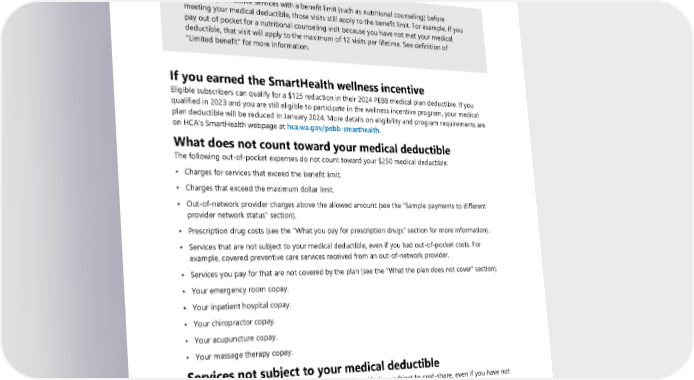 Your medical deductible applies to all services unless otherwise stated in this COC. See below for services that are not subject to your medical deductible. Services apply to your UMP medical deductible in the order claims are received, not necessarily in the order the member receives the services. Note: You also pay a separate deductible for prescription drugs. See the “What you pay for prescription drugs” section for more information. ALERT! If you receive services with a benefit limit (such as nutritional counseling) before meeting your medical deductible, those visits still apply to the benefit limit. For example, if you pay out of pocket for a nutritional counseling visit because you have not met your medical deductible, that visit will apply to the maximum of 12 visits per lifetime. See definition of “Limited benefit” for more information. If you earned the SmartHealth wellness incentive Eligible subscribers can qualify for a $125 reduction in their 2024 PEBB medical plan deductible. If you qualified in 2023 and you are still eligible to participate in the wellness incentive program, your medical plan deductible will be reduced in January 2024. More details on eligibility and program requirements are on HCA's SmartHealth webpage at hca.wa.gov/pebb-smarthealth. What does not count toward your medical deductible The following out-of-pocket expenses do not count toward your $250 medical deductible: • Charges for services that exceed the benefit limit. • Charges that exceed the maximum dollar limit. • Out-of-network provider charges above the allowed amount (see the “Sample payments to different provider network status” section). • Prescription drug costs (see the “What you pay for prescription drugs” section for more information). • Services that are not subject to your medical deductible, even if you had out-of-pocket costs. For example, covered preventive care services received from an out-of-network provider. • Services you pay for that are not covered by the plan (see the “What the plan does not cover” section). • Your emergency room copay. • Your inpatient hospital copay. • Your chiropractor copay. • Your acupuncture copay. • Your massage therapy copay. Services not subject to your medical deductible The plan pays the allowed amount for the services listed below, subject to cost-share, even if you have not met your medical deductible. When you see a preferred or participating provider, you do not have to meet your medical deductible before the plan pays for these services: • Covered contraceptive supplies and services (see the “Family planning services” benefit). • Covered preventive care services, including covered immunizations. • Diabetes Control Program. 24 2024 UMP Classic (PEBB) Certificate of Coverage