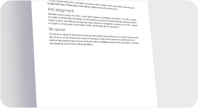 Regence BlueShield nor UMP is responsible for the quality of health care you receive, except as provided by law. In addition, UMP will not be liable to any person or entity for the inability or failure to procure or provide the benefits of the plan by reason of epidemic, disaster, or other cause or condition beyond UMP’s control. Governing law The plan is governed by and construed in accordance with the laws of the United States of America and by applicable laws of Washington State without regard to its conflict of law rules. Anti-assignment Members may not assign this COC, or any rights, interests or obligations contained in this COC, in whole or in part, to a third party (including, but not limited to, providers of medical services), without the plan’s written consent. Any attempt to assign any rights, interests or obligations contained in this COC, in whole or in part, to a third party is void and/or invalid, and the plan will not recognize it. No waiver The failure or refusal of either party to demand strict performance of the plan or to enforce any provision will not act as or be construed as a waiver of that party’s right to later demand its performance or to enforce that provision. No provision of the plan will be considered waived unless such waiver is in writing and signed by one of HCA’s authorized officers. 150 2024 UMP Classic (PEBB) Certificate of Coverage