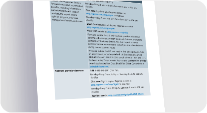 2024 UMP Classic (PEBB) Certificate of Coverage Directory Directory: medical services Contact type and description Contact information UMP Customer Service Call: 1-888-849-3681 (TRS: 711) Contact UMP Customer Service Monday–Friday: 5 a.m. to 8 p.m.; Saturday: 8 a.m. to 4:30 p.m. for questions about your medical (Pacific) benefits, including information Chat now: Sign in to your Regence account at on behavioral health support ump.regence.com/ump/signin to chat now services, the expert second Monday–Friday: 5 a.m. to 8 p.m.; Saturday: 8 a.m. to 4:30 p.m. opinion program, your care (Pacific) management benefit, and more. Email: Send secure email via your Regence account at ump.regence.com/ump/signin Visit: UMP website at ump.regence.com/pebb If you are outside the U.S. and you have questions about your benefits and coverage, you can use email, chat now, or Skype to contact UMP Customer Service. You may request to have a customer service representative contact you at a scheduled time during normal business hours. If you are outside the U.S. and need to find a local provider, make an appointment, or be hospitalized, call Blue Cross Blue Shield Global® Core at 1-800-810-2583 or call collect at 1-804-673-1177, 24 hours a day, 7 days a week. You can also use the online provider search tool on the Blue Cross Blue Shield Global Core website at bcbsglobalcore.com. Network provider directory Call: 1-888-849-3681 (TRS: 711) Monday–Friday: 5 a.m. to 8 p.m.; Saturday: 8 a.m. to 4:30 p.m. (Pacific) Chat now: Sign in to your Regence account at ump.regence.com/ump/signin to chat now Monday–Friday: 5 a.m. to 8 p.m.; Saturday: 8 a.m. to 4:30 p.m. (Pacific) Provider search: ump.regence.com/go/pebb/UMP-Classic 2024 UMP Classic (PEBB) Certificate of Coverage 1