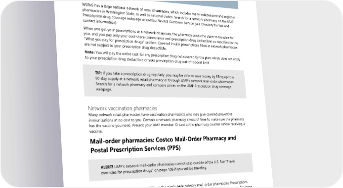 Retail pharmacies FOR MEDICARE RETIREES: See the “How UMP Classic prescription drug coverage works with Medicare” section for more information on how UMP prescription drug coverage works with Medicare. WSRxS has a large national network of retail pharmacies, which includes many independent and regional pharmacies in Washington State, as well as national chains. Search for a network pharmacy on the UMP Prescription drug coverage webpage or contact WSRxS Customer Service (see Directory for link and contact information). When you get your prescriptions at a network pharmacy, the pharmacy sends the claim to the plan for you, and you pay only your cost-share (coinsurance and prescription drug deductible) as described in the “What you pay for prescription drugs” section. Covered insulin prescriptions filled at network pharmacies are not subject to your prescription drug deductible. Note: You will pay the entire cost for any prescription drug not covered by the plan, which does not apply to your prescription drug deductible or your prescription drug out-of-pocket limit. TIP: If you take a prescription drug regularly, you may be able to save money by filling up to a 90-day supply at a network retail pharmacy or through UMP’s network mail-order pharmacies. Search for a network pharmacy and compare prices on the UMP Prescription drug coverage webpage. Network vaccination pharmacies Many network retail pharmacies have vaccination pharmacists who may give covered preventive immunizations at no cost to you. Contact a network pharmacy ahead of time to make sure the pharmacy has the vaccine you need. Present your UMP member ID card at the pharmacy counter before receiving a vaccine. Mail-order pharmacies: Costco Mail-Order Pharmacy and Postal Prescription Services (PPS) ALERT! UMP’s network mail-order pharmacies cannot ship outside of the U.S. See “Travel overrides for prescription drugs” on page 106 if you will be traveling. Costco Mail-Order Pharmacy and PPS are the plan’s only network mail-order pharmacies. Prescriptions purchased through other mail-order pharmacies will not be covered if UMP is your primary plan. For more information about mail-order, visit the UMP Prescription drug coverage webpage, contact UMP’s network mail-order pharmacies, or contact WSRxS Customer Service. See the Directory pages at the beginning of this booklet for links and contact information. Note: You may mail in a prescription, however only a provider can call, fax, or electronically submit a prescription to the pharmacy. You must follow these instructions to avoid a delay in filling your prescription. 2024 UMP Classic (PEBB) Certificate of Coverage 99
