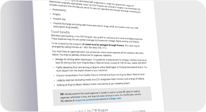 • Provide a list from which participants may select their surgeon if the participant is approved for surgery. Virginia Mason Medical Center must determine if surgery for joint replacement is appropriate based on established medical guidelines. You may find these guidelines on the Policies that affect your care webpage (see Directory for link). What is included in the COE Program In general, all eligible expenses associated with single knee or single hip replacement surgery (if determined surgically appropriate) under the COE Program are covered. If surgery is recommended, this includes expenses from the day you arrive for your pre-operative visit through discharge, including your: • Assessment(s). • Surgery. • Hospital stay. • Hospital discharge (excluding take-home prescription drugs, which are covered under your UMP prescription drug benefit). Travel benefits Members participating in the COE Program may qualify for assistance with travel and lodging expenses. These expenses may include partial coverage by Premera for mileage, flights, parking, and lodging. To be covered by the program, all travel must be arranged through Premera. This travel may be arranged by calling Premera at 1-855-784-4563 (TRS: 711). You must have an approved adult care companion, whose travel expenses will be covered as described below. You may be partially reimbursed for expenses related to: • Mileage for driving within Washington. To qualify for reimbursement for mileage, members must live at least 60 driving miles from Virginia Mason Medical Center, located at 1100 9th Ave., Seattle, WA 98101. • Flights departing from and arriving at airports within Washington or Portland International Airport. You must depart from the airport closest to your residence. • Ground transportation from Seattle-Tacoma International Airport to Virginia Mason Medical Center. • Lodging expenses (excluding meals) at a COE-designated hotel. Premera must arrange all lodging. • Parking at Virginia Mason Medical Center and parking at your departing airport. TIP: Reimbursement for travel expenses is based on cost or current IRS rates for medical expenses, whichever is less, and may not cover all of your costs. For the IRS rates, visit the IRS website at irs.gov/tax-professionals/standard-mileage-rates. What is not included in the COE Program If you receive services outside of the COE Program, or choose to receive services at Virginia Mason Medical Center that are not related to your single knee or single hip replacement surgery, covered services will be processed at the standard rate. The following services are not included in the COE Program (but may be covered by other plan benefits): • Care received as part of the plan Virginia Mason Medical Center gives you as a condition of surgery, regardless of where you receive care. Examples include tobacco cessation and weight loss programs. 2024 UMP Classic (PEBB) Certificate of Coverage 59