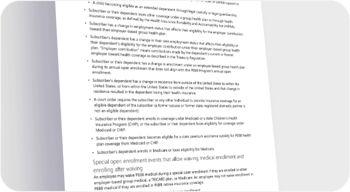 Special open enrollment events that allow adding or removing a dependent Any of the following events may create a special open enrollment: • Subscriber gains a new dependent due to: ▪ Marriage or registering a state-registered domestic partnership. ▪ Birth, adoption, or when the subscriber has assumed a legal obligation for total or partial support in anticipation of adoption. ▪ A child becoming eligible as an extended dependent through legal custody or legal guardianship. • Subscriber or their dependent loses other coverage under a group health plan or through health insurance coverage, as defined by the Health Insurance Portability and Accountability Act (HIPAA). • Subscriber has a change in employment status that affects their eligibility for the employer contribution toward their employer-based group health plan. • Subscriber’s dependent has a change in their own employment status that affects their eligibility or their dependent’s eligibility for the employer contribution under their employer-based group health plan. “Employer contribution” means contributions made by the dependent’s current or former employer toward health coverage as described in the Treasury Regulation. • Subscriber or their dependent has a change in enrollment under an employer-based group health plan during its annual open enrollment that does not align with the PEBB Program’s annual open enrollment. • Subscriber’s dependent has a change in residence from outside of the United States to within the United States, or from within the United States to outside of the United States and that change in residence resulted in the dependent losing their health insurance. • A court order requires the subscriber or any other individual to provide insurance coverage for an eligible dependent of the subscriber (a former spouse or former state-registered domestic partner is not an eligible dependent). • Subscriber or their dependent enrolls in coverage under Medicaid or a state Children’s Health Insurance Program (CHIP), or the subscriber or their dependent loses eligibility for coverage under Medicaid or CHIP. • Subscriber or their dependent becomes eligible for a state premium assistance subsidy for PEBB health plan coverage from Medicaid or CHIP. • Subscriber’s dependent enrolls in Medicare or loses eligibility for Medicare. Special open enrollment events that allow waiving medical enrollment and enrolling after waiving An employee may waive PEBB medical during a special open enrollment if they are enrolled in other employer-based group medical, a TRICARE plan, or Medicare. An employee may not waive enrollment in PEBB medical if they are enrolled in PEBB retiree insurance coverage. Any of the following events may create a special open enrollment: • Employee gains a new dependent due to: ▪ Marriage or registering a state-registered domestic partnership. ▪ Birth, adoption, or when the employee has assumed a legal obligation for total or partial support in anticipation of adoption. ▪ A child becoming eligible as an extended dependent through legal custody or legal guardianship. 162 2024 UMP Classic (PEBB) Certificate of Coverage