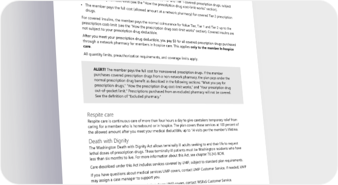 Prescription drugs For covered prescription drugs, UMP members in hospice care receive special coverage when using network pharmacies, including the network specialty drug pharmacy and the network mail-order pharmacies. Until your prescription drug deductible is met: • The member pays the normal coinsurance for Value Tier and Tier 1 covered prescription drugs, subject to the prescription cost-limit (see the "How the prescription drug cost-limit works" section). • The member pays the full cost (allowed amount at a network pharmacy) for covered Tier 2 prescription drugs. For covered insulins, the member pays the normal coinsurance for Value Tier, Tier 1 and Tier 2 up to the prescription cost-limit (see the "How the prescription drug cost-limit works" section). Covered insulins are not subject to your prescription drug deductible. After you meet your prescription drug deductible, you pay $0 for all covered prescription drugs purchased through a network pharmacy for members in hospice care. This applies only to the member in hospice care. All quantity limits, preauthorization requirements, and coverage limits apply. ALERT! The member pays the full cost for noncovered prescription drugs. If the member purchases covered prescription drugs from a non-network pharmacy, the plan pays under the normal prescription drug benefit as described in the following sections: “What you pay for prescription drugs,” “How the prescription drug cost-limit works,” and “Your prescription drug out-of-pocket limit.” Prescriptions purchased from an excluded pharmacy will not be covered. See the definition of “Excluded pharmacy.” Respite care Respite care is continuous care of more than four hours a day to give caretakers temporary relief from caring for a member who is homebound or in hospice. The plan covers these services at 100 percent of the allowed amount after you meet your medical deductible, up to 14 visits per the member’s lifetime. Death with Dignity The Washington Death with Dignity Act allows terminally ill adults seeking to end their life to request lethal doses of prescription drugs. These terminally ill patients must be Washington residents who have less than six months to live. For more information about this Act, see chapter 70.245 RCW. Care described under this Act includes services covered by UMP, subject to standard plan requirements. If you have questions about medical services UMP covers, contact UMP Customer Service. If needed, UMP may assign a case manager to support you. If you have questions about prescription drugs UMP covers, contact WSRxS Customer Service. If your current provider is unable to meet your needs, or if you need assistance in finding a provider for these services, visit End of Life Washington’s website at endoflifewa.org. End of Life Washington is a community resource available to support the public in finding available providers. For more information about the Death with Dignity Act, visit: • The Department of Health’s website at doh.wa.gov/YouandYourFamily/IllnessandDisease/DeathwithDignityAct. 2024 UMP Classic (PEBB) Certificate of Coverage 55