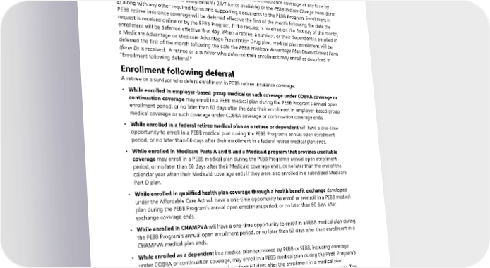 A retiree or a survivor who voluntarily terminates their enrollment in a medical plan also terminates all other health plan enrollment and enrollment for all eligible dependents. Once coverage is terminated, a retiree or a survivor may not enroll again in the future unless they reestablish eligibility for PEBB insurance coverage by becoming newly eligible. Deferring enrollment An enrolled retiree or survivor may defer enrollment in PEBB retiree insurance coverage at any time by submitting the request online using Benefits 24/7 (once available) or the PEBB Retiree Change Form (form E) along with any other required forms and supporting documents to the PEBB Program. Enrollment in PEBB retiree insurance coverage will be deferred effective the first of the month following the date the request is received online or by the PEBB Program. If the request is received on the first day of the month, enrollment will be deferred effective that day. When a retiree, a survivor, or their dependent is enrolled in a Medicare Advantage or Medicare Advantage Prescription Drug plan, medical plan enrollment will be deferred the first of the month following the date the PEBB Medicare Advantage Plan Disenrollment Form (form D) is received. A retiree or a survivor who deferred their enrollment may enroll as described in “Enrollment following deferral.” Enrollment following deferral A retiree or a survivor who defers enrollment in PEBB retiree insurance coverage: • While enrolled in employer-based group medical or such coverage under COBRA coverage or continuation coverage may enroll in a PEBB medical plan during the PEBB Program’s annual open enrollment period, or no later than 60 days after the date their enrollment in employer-based group medical coverage or such coverage under COBRA coverage or continuation coverage ends. • While enrolled in a federal retiree medical plan as a retiree or dependent will have a one-time opportunity to enroll in a PEBB medical plan during the PEBB Program’s annual open enrollment period, or no later than 60 days after their enrollment in a federal retiree medical plan ends. • While enrolled in Medicare Parts A and B and a Medicaid program that provides creditable coverage may enroll in a PEBB medical plan during the PEBB Program’s annual open enrollment period, or no later than 60 days after their Medicaid coverage ends, or no later than the end of the calendar year when their Medicaid coverage ends if they were also enrolled in a subsidized Medicare Part D plan. • While enrolled in qualified health plan coverage through a health benefit exchange developed under the Affordable Care Act will have a one-time opportunity to enroll or reenroll in a PEBB medical plan during the PEBB Program’s annual open enrollment period, or no later than 60 days after exchange coverage ends. • While enrolled in CHAMPVA will have a one-time opportunity to enroll in a PEBB medical plan during the PEBB Program’s annual open enrollment period, or no later than 60 days after their enrollment in a CHAMPVA medical plan ends. • While enrolled as a dependent in a medical plan sponsored by PEBB or SEBB, including coverage under COBRA or continuation coverage, may enroll in a PEBB medical plan during the PEBB Program’s annual open enrollment period, or no later than 60 days after the enrollment in a medical plan sponsored by PEBB or SEBB ends, or such coverage under COBRA or continuation coverage ends. The evidence of continuous enrollment required to enroll as described below may include a health plan sponsored by a Washington State educational service district if enrollment was deferred prior to January 1, 2024. Note: Enrollment in the PEBB Program’s Medicare Advantage Prescription Drug (MAPD) plan may not be retroactive. If a subscriber elects an MAPD plan and the online enrollment or the required forms are received by the PEBB Program after the date PEBB retiree insurance coverage is to begin, the subscriber 174 2024 UMP Classic (PEBB) Certificate of Coverage