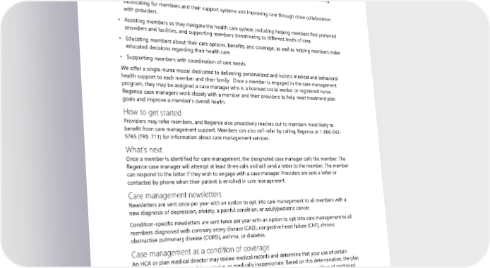 ensuring members understand their benefits, and providing members ongoing support through case management, as needed. Contact UMP Customer Service for more information. Care management Regence care management supports the unique needs of members with chronic, serious, or sudden illness or injury and prioritizes those needs by providing personalized services that enhance well-being. Care management teams can help with: • Advocating for members and their support systems and improving care through close collaboration with providers. • Assisting members as they navigate the health care system, including helping members find preferred providers and facilities, and supporting members transitioning to different levels of care. • Educating members about their care options, benefits, and coverage, as well as helping members make educated decisions regarding their health care. • Supporting members with coordination of care needs. We offer a single-nurse model dedicated to delivering personalized and holistic medical and behavioral health support to each member and their family. Once a member is engaged in the care management program, they may be assigned a case manager who is a licensed social worker or registered nurse. Regence case managers work closely with a member and their providers to help meet treatment plan goals and improve a member’s overall health. How to get started Providers may refer members, and Regence also proactively reaches out to members most likely to benefit from care management support. Members can also self-refer by calling Regence at 1-866-543- 5765 (TRS: 711) for information about care management services. What’s next Once a member is identified for care management, the designated case manager calls the member. The Regence case manager will attempt at least three calls and will send a letter to the member. The member can respond to the letter if they wish to engage with a case manager. Providers are sent a letter or contacted by phone when their patient is enrolled in care management. Care management newsletters Newsletters are sent once per year with an option to opt into care management to all members with a new diagnosis of depression, anxiety, a painful condition, or adult/pediatric cancer. Condition-specific newsletters are sent twice per year with an option to opt into care management to all members diagnosed with coronary artery disease (CAD), congestive heart failure (CHF), chronic obstructive pulmonary disease (COPD), asthma, or diabetes. Case management as a condition of coverage An HCA or plan medical director may review medical records and determine that your use of certain services is potentially harmful, excessive, or medically inappropriate. Based on this determination, the plan may require you to participate in and comply with a case management plan as a condition of continued benefit payment. Chiropractic physician services See the “Spinal and extremity manipulations” benefit. 2024 UMP Classic (PEBB) Certificate of Coverage 43
