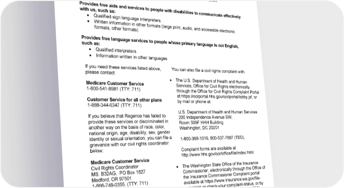 NONDISCRIMINATION NOTICE Regence complies with applicable Federal and Washington state civil rights laws and does not discriminate on the basis of race, color, national origin, age, disability, sex, gender identity or sexual identity. Regence does not exclude people or treat them differently because of race, color, national origin, age, disability, sex, gender identity or sexual orientation. Regence: Provides free aids and services to people with disabilities to communicate effectively with us, such as: • Qualified sign language interpreters • Written information in other formats (large print, audio, and accessible electronic formats, other formats) Provides free language services to people whose primary language is not English, such as: • Qualified interpreters • Information written in other languages If you need these services listed above, You can also file a civil rights complaint with: please contact: Medicare Customer Service • The U.S. Department of Health and Human 1-800-541-8981 (TTY: 711) Services, Office for Civil Rights electronically through the Office for Civil Rights Complaint Portal Customer Service for all other plans at https://ocrportal.hhs.gov/ocr/portal/lobby.jsf, or 1-888-344-6347 (TTY: 711) by mail or phone at: If you believe that Regence has failed to U.S. Department of Health and Human Services provide these services or discriminated in 200 Independence Avenue SW, another way on the basis of race, color, Room 509F HHH Building national origin, age, disability, sex, gender Washington, DC 20201 identity or sexual orientation, you can file a 1-800-368-1019, 800-537-7697 (TDD). grievance with our civil rights coordinator below: Complaint forms are available at Medicare Customer Service http://www.hhs.gov/ocr/office/file/index.html. Civil Rights Coordinator • The Washington State Office of the Insurance MS: B32AG, PO Box 1827 Commissioner, electronically through the Office of Medford, OR 97501 the Insurance Commissioner Complaint portal 1-866-749-0355, (TTY: 711) available at https://www.insurance.wa.gov/file- Fax: 1-888-309-8784 complaint-or-check-your-complaint-status, or by [email protected] phone at 800-562-6900, 360-586-0241 (TDD). Customer Service for all other plans Complaint forms are available at Civil Rights Coordinator https://fortress.wa.gov/oic/onlineservices/cc/pub/c MS CS B32B, P.O. Box 1271 omplaintinformation.aspx Portland, OR 97207-1271 1-888-344-6347, (TTY: 711) [email protected] 01012022.04PF12LNoticeNDMARegence-WA